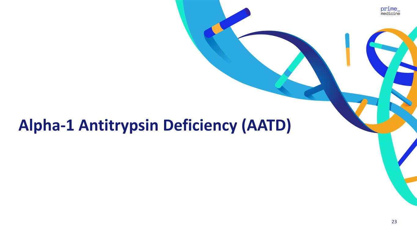 22IND = investigational new drug; CTA = clinical trial application; LNP = lipid nanoparticle; DC = development candidate; PMDA = Japan’s Pharmaceuticals and Medical Devices Agency We Plan to Leverage Platform Modularity to Rapidly Advance Prime Editors for a Majority of Wilson Disease Patients Goal to incorporate into existing regulatory filings Large commercial opportunity in Japan Attractive business case to develop follow-on programs Fast path to DC (potentially off in vitro data) R778L Other Mutations H1069Q (PM577) ANCHOR MUTATION: Large commercial opportunity in U.S. and Europe 1H 2026 IND/CTA Lead in observational study to potentially expedite patient recruitment >90% editing efficiency, minimal preclinical work to formalize DCFollow-on programs to leverage same liver- targeted LNP; swap out guide sequence Goal to incorporate into existing regulatory filings; engage PMDA