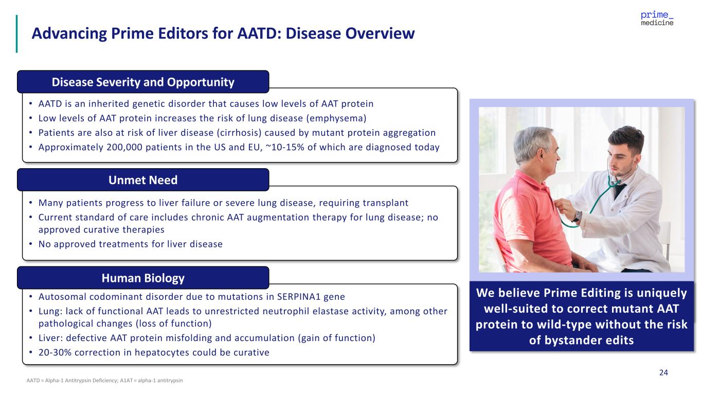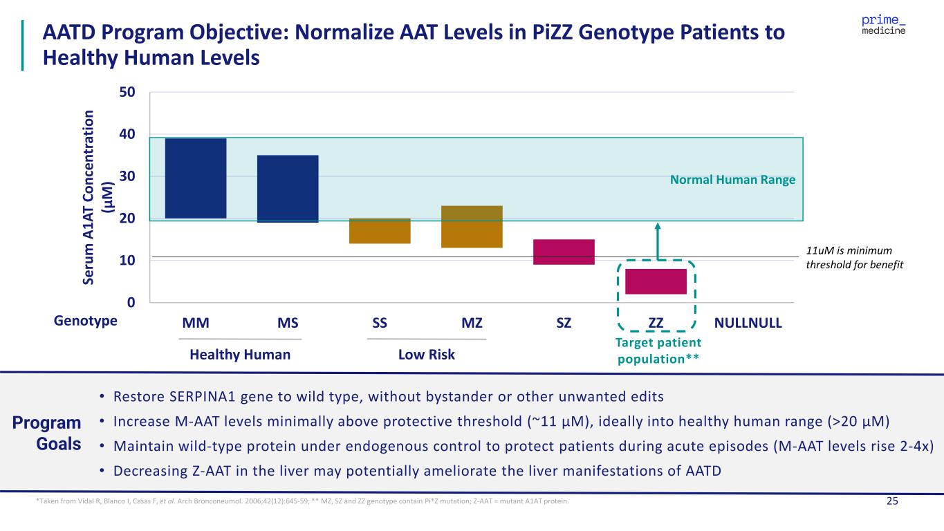 24 Advancing Prime Editors for AATD: Disease Overview AATD = Alpha-1 Antitrypsin Deficiency; A1AT = alpha-1 antitrypsin • AATD is an inherited genetic disorder that causes low levels of AAT protein • Low levels of AAT protein increases the risk of lung disease (emphysema) • Patients are also at risk of liver disease (cirrhosis) caused by mutant protein aggregation • Approximately 200,000 patients in the US and EU, ~10-15% of which are diagnosed today Disease Severity and Opportunity • Many patients progress to liver failure or severe lung disease, requiring transplant • Current standard of care includes chronic AAT augmentation therapy for lung disease; no approved curative therapies • No approved treatments for liver disease Unmet Need • Autosomal codominant disorder due to mutations in SERPINA1 gene • Lung: lack of functional AAT leads to unrestricted neutrophil elastase activity, among other pathological changes (loss of function) • Liver: defective AAT protein misfolding and accumulation (gain of function) • 20-30% correction in hepatocytes could be curative Human Biology We believe Prime Editing is uniquely well-suited to correct mutant AAT protein to wild-type without the risk of bystander edits