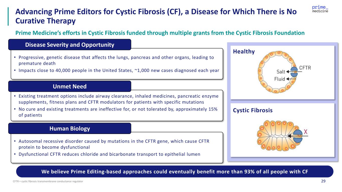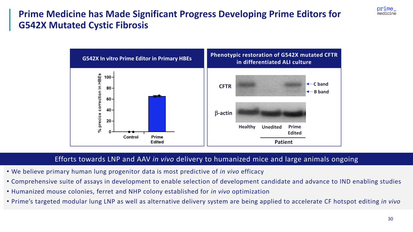 29CFTR = cystic fibrosis transmembrane conductance regulator Advancing Prime Editors for Cystic Fibrosis (CF), a Disease for Which There is No Curative Therapy Prime Medicine’s efforts in Cystic Fibrosis funded through multiple grants from the Cystic Fibrosis Foundation • Progressive, genetic disease that affects the lungs, pancreas and other organs, leading to premature death • Impacts close to 40,000 people in the United States, ~1,000 new cases diagnosed each year Disease Severity and Opportunity • Existing treatment options include airway clearance, inhaled medicines, pancreatic enzyme supplements, fitness plans and CFTR modulators for patients with specific mutations • No cure and existing treatments are ineffective for, or not tolerated by, approximately 15% of patients Unmet Need • Autosomal recessive disorder caused by mutations in the CFTR gene, which cause CFTR protein to become dysfunctional • Dysfunctional CFTR reduces chloride and bicarbonate transport to epithelial lumen Human Biology Cystic Fibrosis Healthy We believe Prime Editing-based approaches could eventually benefit more than 93% of all people with CF
