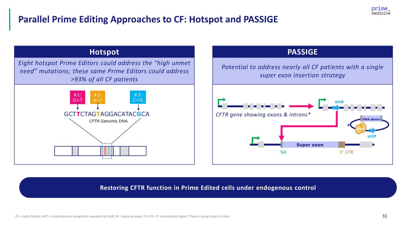 31CF = cystic fibrosis; attP = complimentary recognition sequence for attB; SA = splice acceptor; 3’ UTR = 3’ untranslated region; *Exons in gray introns in black Parallel Prime Editing Approaches to CF: Hotspot and PASSIGE Hotspot PASSIGE Eight hotspot Prime Editors could address the “high unmet need” mutations; these same Prime Editors could address >93% of all CF patients Potential to address nearly all CF patients with a single super exon insertion strategy Super exon SA 3’ UTR attB attP DNA donor + Bxb1 CFTR gene showing exons & introns* Restoring CFTR function in Prime Edited cells under endogenous control