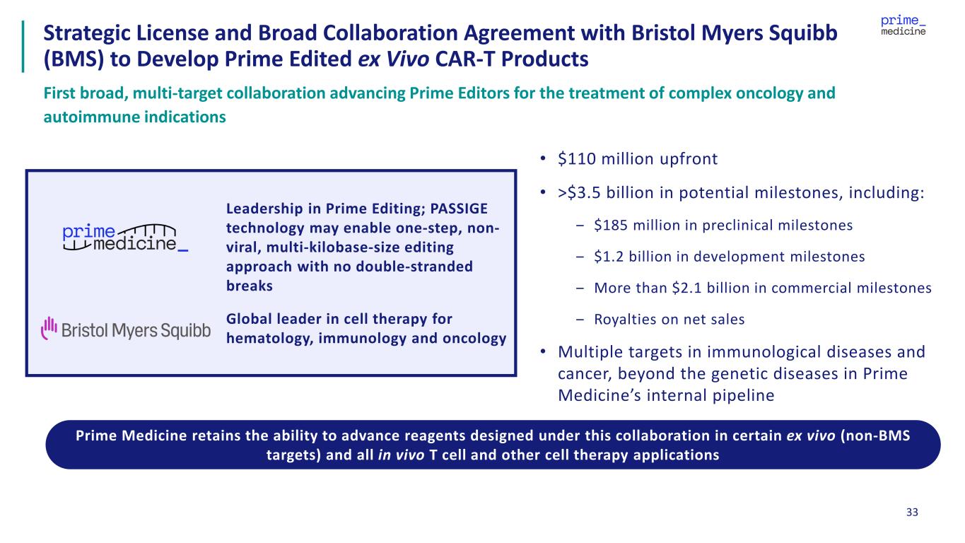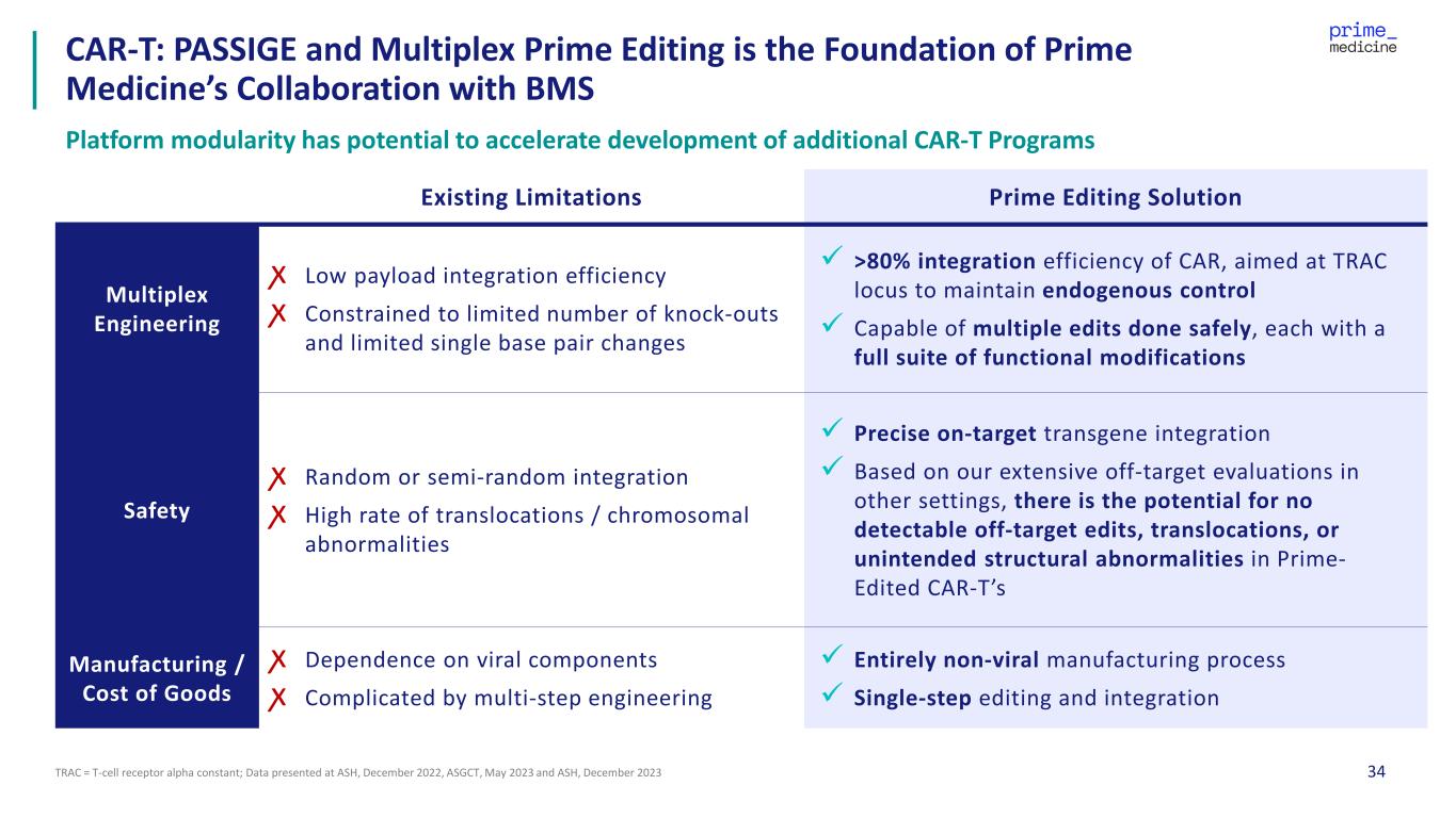 33 Strategic License and Broad Collaboration Agreement with Bristol Myers Squibb (BMS) to Develop Prime Edited ex Vivo CAR-T Products First broad, multi-target collaboration advancing Prime Editors for the treatment of complex oncology and autoimmune indications • $110 million upfront • >$3.5 billion in potential milestones, including: ‒ $185 million in preclinical milestones ‒ $1.2 billion in development milestones ‒ More than $2.1 billion in commercial milestones ‒ Royalties on net sales • Multiple targets in immunological diseases and cancer, beyond the genetic diseases in Prime Medicine’s internal pipeline Leadership in Prime Editing; PASSIGE technology may enable one-step, non- viral, multi-kilobase-size editing approach with no double-stranded breaks Global leader in cell therapy for hematology, immunology and oncology Prime Medicine retains the ability to advance reagents designed under this collaboration in certain ex vivo (non-BMS targets) and all in vivo T cell and other cell therapy applications