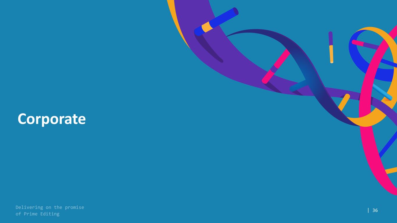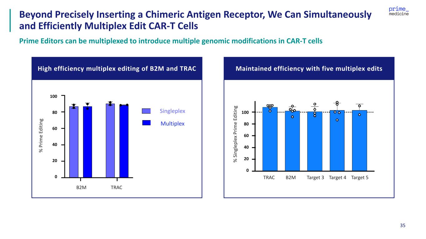 34TRAC = T-cell receptor alpha constant; Data presented at ASH, December 2022, ASGCT, May 2023 and ASH, December 2023 CAR-T: PASSIGE and Multiplex Prime Editing is the Foundation of Prime Medicine’s Collaboration with BMS Platform modularity has potential to accelerate development of additional CAR-T Programs Existing Limitations Prime Editing Solution Multiplex Engineering ꭗ Low payload integration efficiency ꭗ Constrained to limited number of knock-outs and limited single base pair changes >80% integration efficiency of CAR, aimed at TRAC locus to maintain endogenous control Capable of multiple edits done safely, each with a full suite of functional modifications Safety ꭗ Random or semi-random integration ꭗ High rate of translocations / chromosomal abnormalities Precise on-target transgene integration Based on our extensive off-target evaluations in other settings, there is the potential for no detectable off-target edits, translocations, or unintended structural abnormalities in Prime- Edited CAR-T’s Manufacturing / Cost of Goods ꭗ Dependence on viral components ꭗ Complicated by multi-step engineering Entirely non-viral manufacturing process Single-step editing and integration