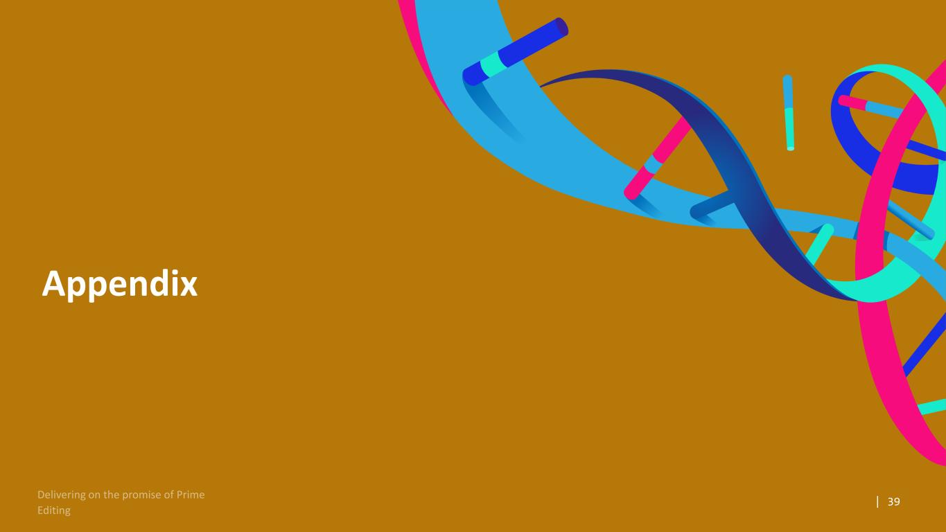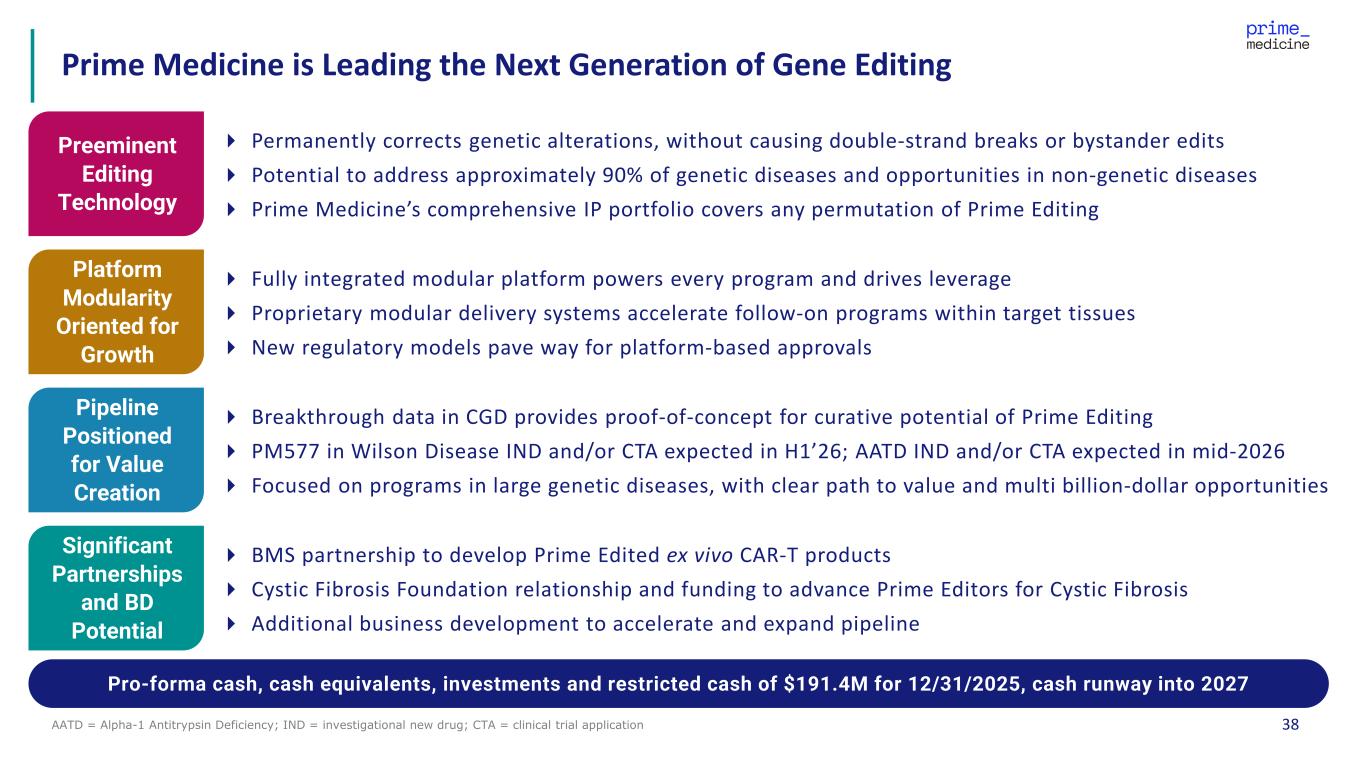 37 Our Strategy to Maximize the Broad Therapeutic Potential of Prime Editing Within Our Core Outside Our Core Enabling Innovation By pairing our internal resources with strategic partners and best-in-class enabling technologies, we aim to accelerate platform development and extend the reach of Prime Editing Funding accelerates the development of Prime Editors for Cystic Fibrosis Developing Prime Edited CAR-T products leveraging PASSIGE and platform Partner at the right time to fund, advance and commercialize our wholly owned pipeline programs (e.g., liver, lung) Form strategic partnerships to access expertise and expand into therapeutic areas beyond our near-term internal focus (e.g., cell therapy, CNS) Access best-in-class enabling technologies to unlock the full potential of Prime Editing (e.g., delivery technologies)