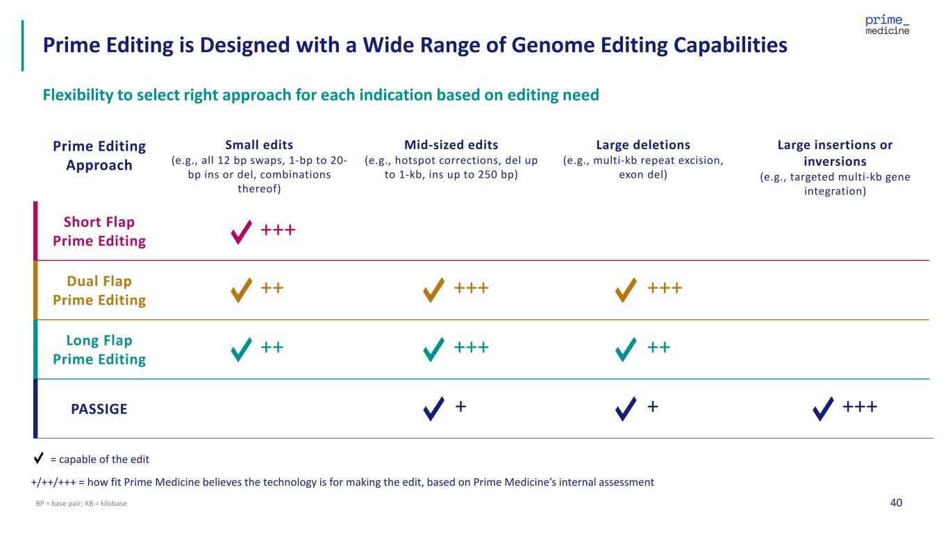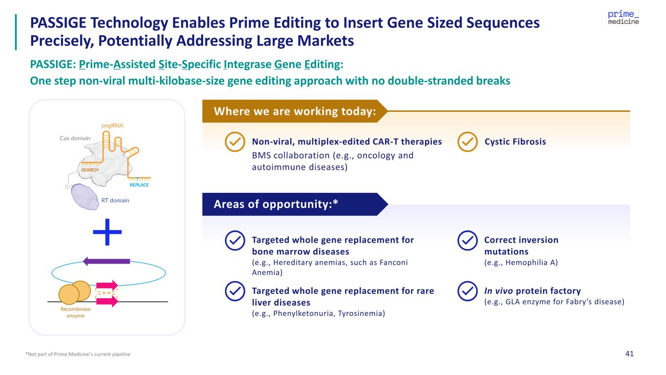 40BP = base pair; KB = kilobase Prime Editing is Designed with a Wide Range of Genome Editing Capabilities Flexibility to select right approach for each indication based on editing need Prime Editing Approach Small edits (e.g., all 12 bp swaps, 1-bp to 20- bp ins or del, combinations thereof) Mid-sized edits (e.g., hotspot corrections, del up to 1-kb, ins up to 250 bp) Large deletions (e.g., multi-kb repeat excision, exon del) Large insertions or inversions (e.g., targeted multi-kb gene integration) Short Flap Prime Editing Dual Flap Prime Editing Long Flap Prime Editing PASSIGE +++ ++ +++ ++ ++ +++ +++ +/++/+++ = how fit Prime Medicine believes the technology is for making the edit, based on Prime Medicine’s internal assessment = capable of the edit +++++