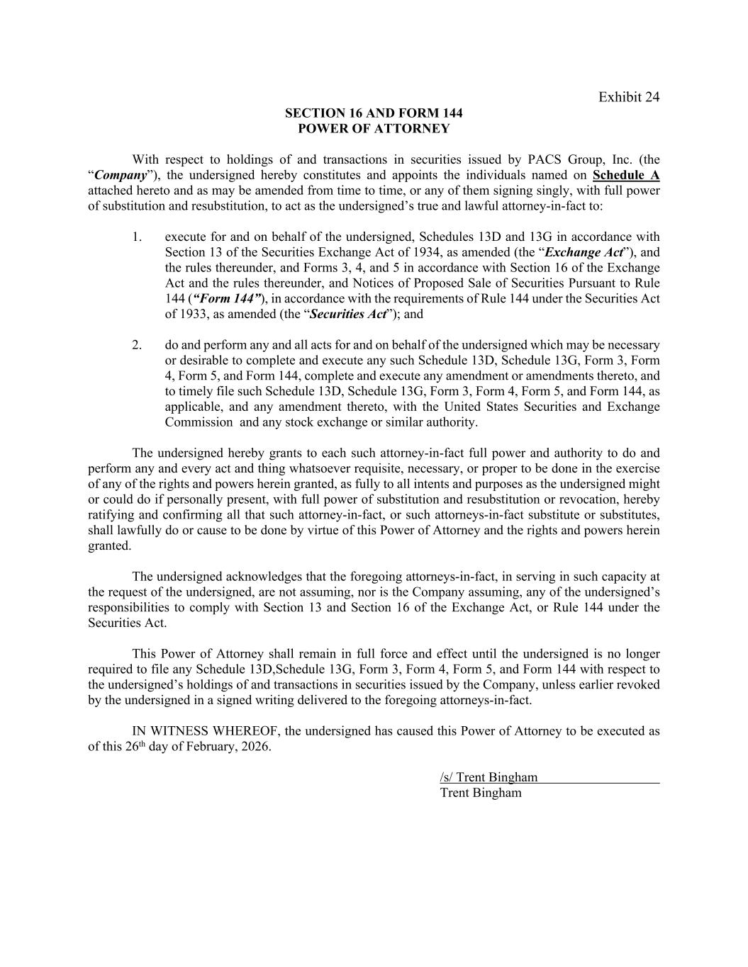 Exhibit 24 SECTION 16 AND FORM 144 POWER OF ATTORNEY With respect to holdings of and transactions in securities issued by PACS Group, Inc. (the “Company”), the undersigned hereby constitutes and appoints the individuals named on Schedule A attached hereto and as may be amended from time to time, or any of them signing singly, with full power of substitution and resubstitution, to act as the undersigned’s true and lawful attorney-in-fact to: 1. execute for and on behalf of the undersigned, Schedules 13D and 13G in accordance with Section 13 of the Securities Exchange Act of 1934, as amended (the “Exchange Act”), and the rules thereunder, and Forms 3, 4, and 5 in accordance with Section 16 of the Exchange Act and the rules thereunder, and Notices of Proposed Sale of Securities Pursuant to Rule 144 (“Form 144”), in accordance with the requirements of Rule 144 under the Securities Act of 1933, as amended (the “Securities Act”); and 2. do and perform any and all acts for and on behalf of the undersigned which may be necessary or desirable to complete and execute any such Schedule 13D, Schedule 13G, Form 3, Form 4, Form 5, and Form 144, complete and execute any amendment or amendments thereto, and to timely file such Schedule 13D, Schedule 13G, Form 3, Form 4, Form 5, and Form 144, as applicable, and any amendment thereto, with the United States Securities and Exchange Commission and any stock exchange or similar authority. The undersigned hereby grants to each such attorney-in-fact full power and authority to do and perform any and every act and thing whatsoever requisite, necessary, or proper to be done in the exercise of any of the rights and powers herein granted, as fully to all intents and purposes as the undersigned might or could do if personally present, with full power of substitution and resubstitution or revocation, hereby ratifying and confirming all that such attorney-in-fact, or such attorneys-in-fact substitute or substitutes, shall lawfully do or cause to be done by virtue of this Power of Attorney and the rights and powers herein granted. The undersigned acknowledges that the foregoing attorneys-in-fact, in serving in such capacity at the request of the undersigned, are not assuming, nor is the Company assuming, any of the undersigned’s responsibilities to comply with Section 13 and Section 16 of the Exchange Act, or Rule 144 under the Securities Act. This Power of Attorney shall remain in full force and effect until the undersigned is no longer required to file any Schedule 13D,Schedule 13G, Form 3, Form 4, Form 5, and Form 144 with respect to the undersigned’s holdings of and transactions in securities issued by the Company, unless earlier revoked by the undersigned in a signed writing delivered to the foregoing attorneys-in-fact. IN WITNESS WHEREOF, the undersigned has caused this Power of Attorney to be executed as of this 26th day of February, 2026. /s/ Trent Bingham Trent Bingham