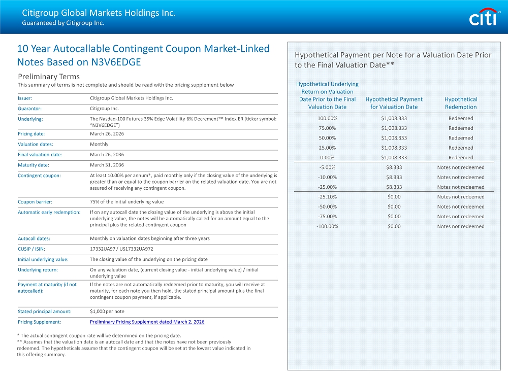 Preliminary Terms This summary of terms is not complete and should be read with the pricing supplement below Citigroup Global Markets Holdings Inc. Issuer: Citigroup Inc. Guarantor: The Nasdaq - 100 Futures 35% Edge Volatility 6% Decrement Index ER (ticker symbol: “N3V6EDGE”) Underlying: March 26, 2026 Pricing date: Monthly Valuation dates: March 26, 2036 Final valuation date: March 31, 2036 Maturity date: At least 10.00% per annum*, paid monthly only if the closing value of the underlying is greater than or equal to the coupon barrier on the related valuation date. You are not assured of receiving any contingent coupon. Contingent coupon: 75% of the initial underlying value Coupon barrier: If on any autocall date the closing value of the underlying is above the initial underlying value, the notes will be automatically called for an amount equal to the principal plus the related contingent coupon Automatic early redemption: Monthly on valuation dates beginning after three years Autocall dates: 17332UA97 / US17332UA972 CUSIP / ISIN: The closing value of the underlying on the pricing date Initial underlying value: On any valuation date, (current closing value - initial underlying value) / initial underlying value Underlying return: If the notes are not automatically redeemed prior to maturity, you will receive at maturity, for each note you then hold, the stated principal amount plus the final contingent coupon payment, if applicable. Payment at maturity (if not autocalled): $1,000 per note Stated principal amount: Preliminary Pricing Supplement dated March 2, 2026 Pricing Supplement: Citigroup Global Markets Holdings Inc. Guaranteed by Citigroup Inc. 10 Year Autocallable Contingent Coupon Market - Linked Notes Based on N3V6EDGE Hypothetical Payment per Note for a Valuation Date Prior to the Final Valuation Date** Hypothetical Redemption Hypothetical Payment for Valuation Date Hypothetical Underlying Return on Valuation Date Prior to the Final Valuation Date Redeemed $1,008.333 100.00% Redeemed $1,008.333 75.00% Redeemed $1,008.333 50.00% Redeemed $1,008.333 25.00% Redeemed $1,008.333 0.00% Notes not redeemed $ 8.333 - 5.00% Notes not redeemed $8.333 - 10.00% Notes not redeemed $8.333 - 25.00% Notes not redeemed $0.00 - 25.10% Notes not redeemed $0.00 - 50.00% Notes not redeemed $0.00 - 75.00% Notes not redeemed $0.00 - 100.00% * The actual contingent coupon rate will be determined on the pricing date. ** Assumes that the valuation date is an autocall date and that the notes have not been previously redeemed. The hypotheticals assume that the contingent coupon will be set at the lowest value indicated in this offering summary.