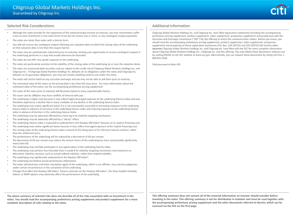 Selected Risk Considerations • Although the notes provide for the repayment of the stated principal amount at maturity, you may nevertheless suffer a loss on your investment in real value terms if you do not receive one or more, or any contingent coupon payments. • The notes are riskier than notes with a shorter term. • You will not receive any contingent coupon following any valuation date on which the closing value of the underlying on that valuation date is less than the coupon barrier. • The notes may be automatically redeemed prior to maturity, limiting your opportunity to receive contingent coupons if the underlying performs in a way that would otherwise be favorable. • The notes do not offer any upside exposure to the underlying. • The notes are particularly sensitive to the volatility of the closing value of the underlying on or near the valuation dates. • The notes are unsecured debt securities and are subject to the credit risk of Citigroup Global Markets Holdings Inc. and Citigroup Inc. If Citigroup Global Markets Holdings Inc. defaults on its obligations under the notes and Citigroup Inc. defaults on its guarantee obligations, you may not receive anything owed to you under the notes. • The notes will not be listed on any securities exchange and you may not be able to sell them prior to maturity. • The estimated value of the notes on the pricing date is less than the issue price. For more information about the estimated value of the notes, see the accompanying preliminary pricing supplement. • The value of the notes prior to maturity will fluctuate based on many unpredictable factors. • The issuer and its affiliates may have conflicts of interest with you. • The underlying is highly risky because it may reflect highly leveraged exposure to the underlying futures index and may therefore experience a decline that is many multiples of any decline in the underlying futures index. • The underlying may realize significant losses if it is not consistently successful in increasing exposure to the underlying futures index in advance of increases in the underlying futures index and reducing exposure to the underlying futures index in advance of declines in the underlying futures index. • The underlying may be adversely affected by a time lag in its volatility targeting mechanism. • The underlying may be adversely affected by a “decay” effect. • The underlying futures index is expected to underperform the Nasdaq - 100 Index® because of an implicit financing cost. • The underlying may realize significant losses because it may reflect leveraged exposure to the implicit financing cost. • The closing value of the underlying futures index is based on the fixing price of its reference futures contract, rather than the settlement price. • The performance of the underlying will be reduced by a decrement of 6% per annum. • The decrement of 6% per annum may reduce the annual return of the underlying by more (and possibly significantly more) than 6%. • The underlying may not fully participate in any appreciation of the underlying futures index. • The underlying may perform less favorably than it would if its volatility targeting mechanism were based on an alternative volatility measure, such as actual realized volatility, rather than implied volatility. • The underlying may significantly underperform the Nasdaq - 100 Index®. • The underlying has limited actual performance information. • The index administrator and index calculation agent of the underlying, which is our affiliate, may exercise judgments under certain circumstances in the calculation of the underlying. • Changes that affect the Nasdaq - 100 Index®, futures contracts on the Nasdaq - 100 Index®, the Cboe Implied Volatility Indices or NDXP options may adversely affect the performance of the underlying. The above summary of selected risks does not describe all of the risks associated with an investment in the notes. You should read the accompanying preliminary pricing supplement and product supplement for a more complete description of risks relating to the notes. Additional Information Citigroup Global Markets Holdings Inc. and Citigroup Inc. have filed registration statements (including the accompanying preliminary pricing supplement, product supplement, index supplement, prospectus supplement and prospectus) with the Securities and Exchange Commission (“SEC”) for the offering to which this communication relates. Before you invest, you should read the accompanying preliminary pricing supplement, product supplement, index supplement, prospectus supplement and prospectus in those registration statements (File Nos. 333 - 293732 and 333 - 293732 - 02) and the other documents Citigroup Global Markets Holdings Inc. and Citigroup Inc. have filed with the SEC for more complete information about Citigroup Global Markets Holdings Inc., Citigroup Inc. and this offering. You may obtain these documents without cost by visiting EDGAR on the SEC website at www.sec.gov. Alternatively, you can request these documents by calling toll - free 1 - 800 - 831 - 9146. Filed pursuant to Rule 433 This offering summary does not contain all of the material information an investor should consider before investing in the notes. This offering summary is not for distribution in isolation and must be read together with the accompanying preliminary pricing supplement and the other documents referred to therein, which can be accessed via the link on the first page. Citigroup Global Markets Holdings Inc. Guaranteed by Citigroup Inc.