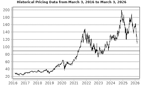 The graph below illustrates the performance of Blackstone's common stock for the period indicated, based on the daily closing levels as reported by Bloomberg, without independent verification. UBS has not conducted any independent review or due diligence of any publicly available information obtained from Bloomberg. The solid line represents its coupon barrier and downside threshold of $88.74, which is equal to 80.00% of the closing level on March 03, 2026. Past performance of the underlying asset is not indicative of the future performance of the underlying asset during the term of the Notes. |