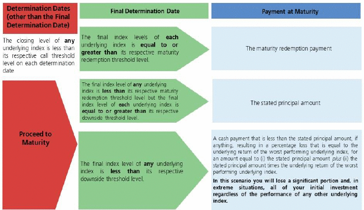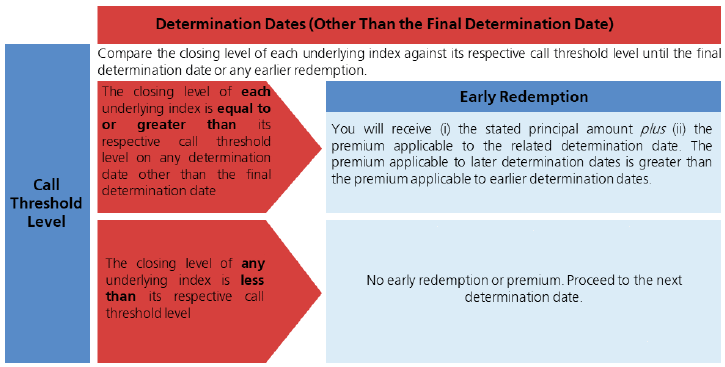 If, on any determination date other than the final determination date, the closing level of each underlying index is equal to or greater than its respective call threshold level, the securities will be automatically redeemed for an early redemption amount on the first call payment date immediately following the related determination date. |