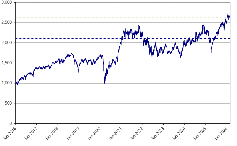 The closing level of the underlying index on February 27, 2026 was 2,632.361. The graph below shows the closing levels of the underlying index for each day from January 1, 2016 to February 27, 2026. The dotted lines represent its downside threshold level of 2,105.889, its maturity redemption threshold level of 2,632.361 and its call threshold level of 2,632.361, which are equal to 80%, 100% and 100%, respectively, of its initial index level. We obtained the information in the graph below from Bloomberg without independent verification. UBS has not undertaken an independent review or due diligence of any publicly available information obtained from Bloomberg. The historical performance of the underlying index should not be taken as an indication of its future performance, and no assurance can be given as to the closing level of the underlying index at any time, including the determination dates.