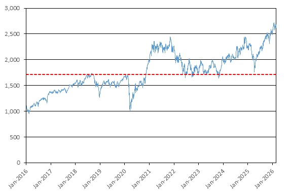 The graph below illustrates the performance of RTY from January 1, 2016 through February 27, 2026, based on the daily closing levels as reported by Bloomberg, without independent verification. UBS has not conducted any independent review or due diligence of any publicly available information obtained from Bloomberg. The closing level of RTY on February 27, 2026 was 2,632.361. The dotted line represents its coupon barrier and downside threshold of 1,711.035, which is equal to 65.00% of its initial level. Past performance of the underlying asset is not indicative of the future performance of the underlying asset during the term of the Notes.