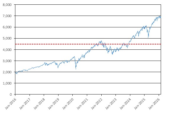 The graph below illustrates the performance of SPX from January 1, 2016 through February 27, 2026, based on the daily closing levels as reported by Bloomberg, without independent verification. UBS has not conducted any independent review or due diligence of any publicly available information obtained from Bloomberg. The closing level of SPX on February 27, 2026 was 6,878.88. The dotted line represents its coupon barrier and downside threshold of 4,471.27, which is equal to 65.00% of its initial level. Past performance of the underlying asset is not indicative of the future performance of the underlying asset during the term of the Notes.