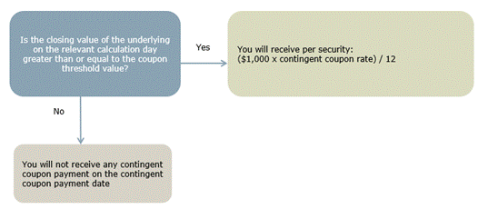A contingent coupon payment will be made on a contingent coupon payment date if and only if the closing value of the underlying on the immediately preceding calculation day is greater than or equal to the coupon threshold value. If the closing value of the underlying is less than the coupon threshold value on any calculation day, you will not receive any contingent coupon payment on the immediately following contingent coupon payment date. If the closing value of the underlying is below the coupon threshold value on each calculation day, you will not receive any contingent coupon payments over the term of the securities.