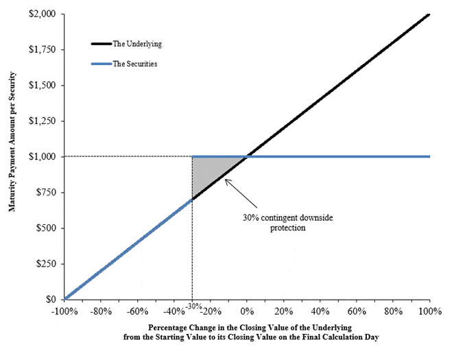 The following profile illustrates the potential maturity payment amount on the securities (excluding the final contingent coupon payment, if any) for a range of hypothetical performances of the underlying from the starting value to the closing value on the final calculation day, assuming the securities have not been automatically redeemed prior to the maturity date. This graph has been prepared for purposes of illustration only. Your actual return on the securities will depend on the actual closing value of the underlying on the final calculation day and whether you hold your securities to the maturity date.