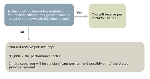 | · | understand that if the closing value of the underlying on the final calculation day is less than the downside threshold value, they will be fully exposed to the decline in the underlying from the starting value and will receive significantly less than the stated principal amount, and possibly nothing, at maturity; |