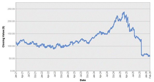 The graph below shows the closing value of Fiserv, Inc. for each day such value was available from January 4, 2021 to February 27, 2026. We obtained the closing values from Bloomberg L.P., without independent verification. If certain corporate transactions occurred during the historical period shown below, including, but not limited to, spin-offs or mergers, then the closing values shown below for the period prior to the occurrence of any such transaction have been adjusted by Bloomberg L.P. as if any such transaction had occurred prior to the first day in the period shown below. You should not take historical closing values as an indication of future performance.