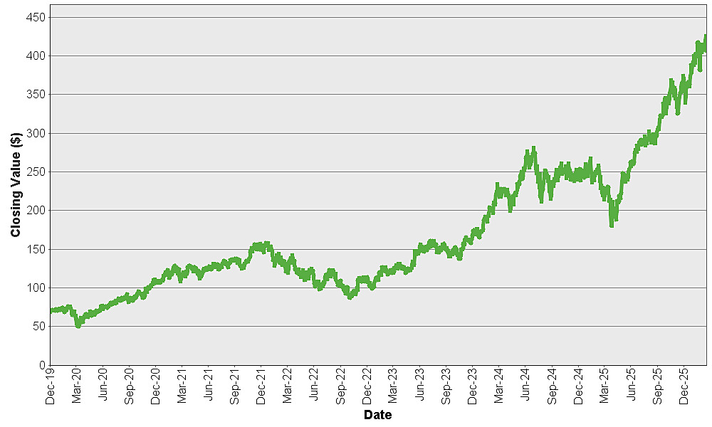 The graph below shows the closing value of the VanEck® Semiconductor ETF for each day such value was available from December 11, 2019 to February 27, 2026. We obtained the closing values from Bloomberg L.P., without independent verification. You should not take historical closing values as an indication of future performance.