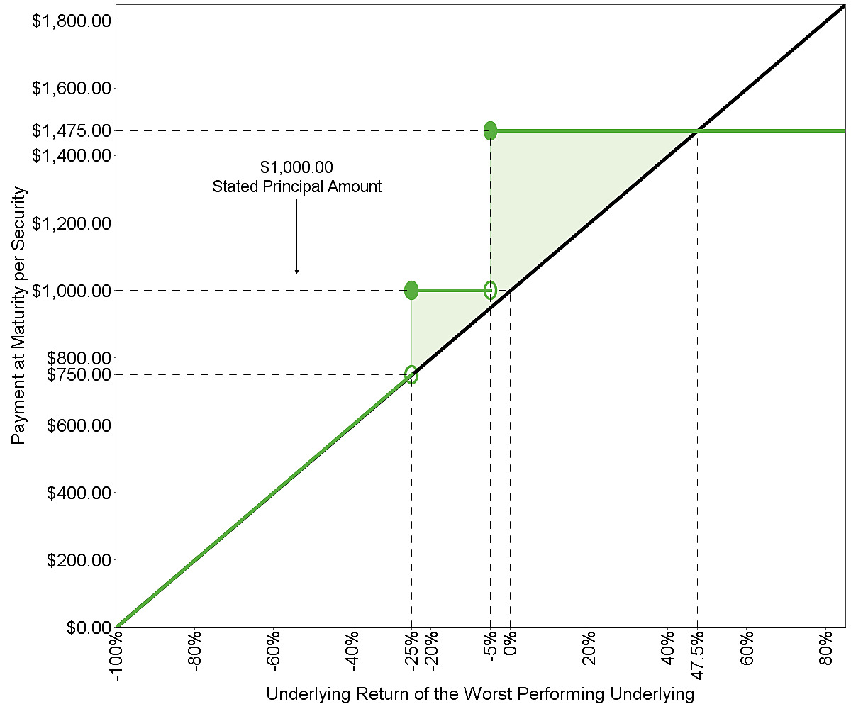The diagram below illustrates your payment at maturity of the securities, assuming the securities have not previously been automatically redeemed, for a range of hypothetical underlying returns of the worst performing underlying on the final valuation date. Your payment at maturity (if the securities are not earlier automatically redeemed) will be determined based solely on the performance of the worst performing underlying on the final valuation date.