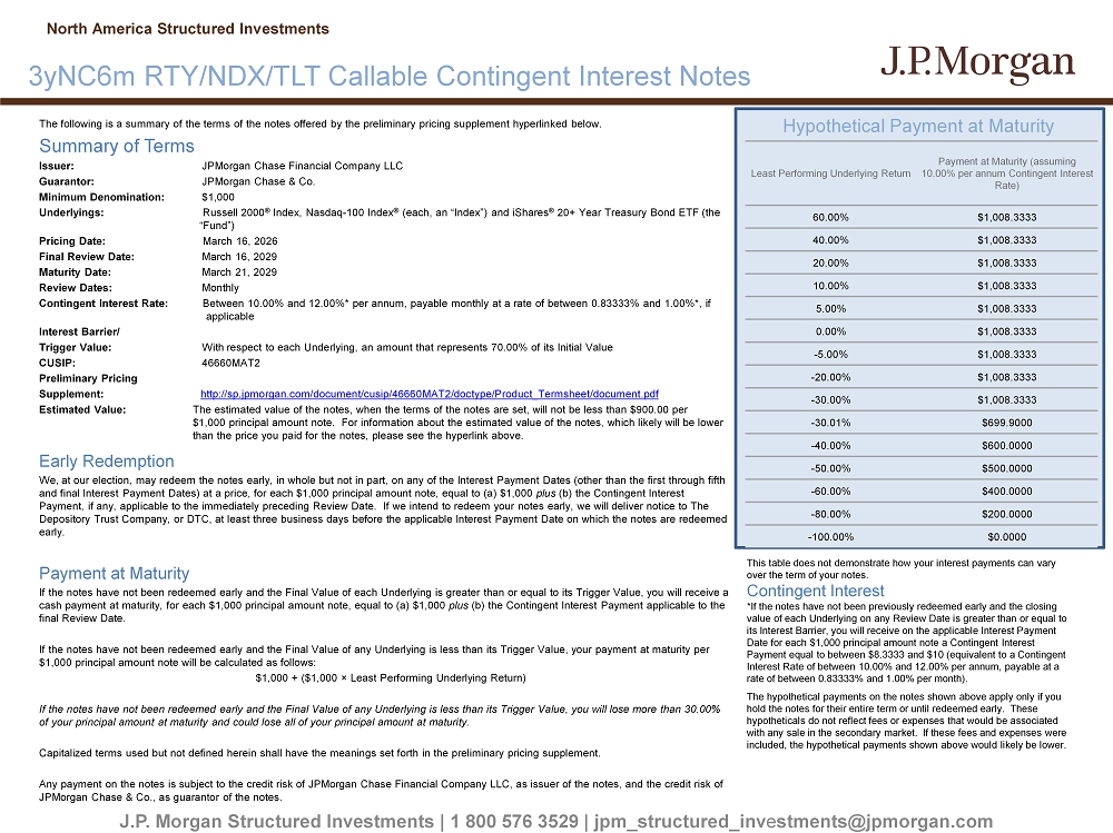 The following is a summary of the terms of the notes offered by the preliminary pricing supplement hyperlinked below. Summary of Terms Issuer: JPMorgan Chase Financial Company LLC Guarantor: JPMorgan Chase & Co. Minimum Denomination: $1,000 Underlyings : Russell 2000 ® Index, Nasdaq - 100 Index ® (each, an “Index”) and iShares ® 20+ Year Treasury Bond ETF (the “Fund”) Pricing Date: March 16, 2026 Final Review Date: March 16, 2029 Maturity Date: March 21, 2029 Review Dates: Monthly Contingent Interest Rate: Between 10.00% and 12.00%* per annum, payable monthly at a rate of between 0.83333% and 1.00%*, if applicable Interest Barrier/ Trigger Value: With respect to each Underlying, an amount that represents 70.00% of its Initial Value CUSIP: 46660MAT2 Preliminary Pricing Supplement: http://sp.jpmorgan.com/document/cusip/46660MAT2/doctype/Product_Termsheet/document.pdf Estimated Value: The estimated value of the notes, when the terms of the notes are set, will not be less than $900.00 per $1,000 principal amount note. For information about the estimated value of the notes, which likely will be lower than the price you paid for the notes, please see the hyperlink above. Early Redemption We, at our election, may redeem the notes early, in whole but not in part, on any of the Interest Payment Dates (other than t he first through fifth and final Interest Payment Dates) at a price, for each $1,000 principal amount note, equal to (a) $1,000 plus (b) the Contingent Interest Payment, if any, applicable to the immediately preceding Review Date. If we intend to redeem your notes early, we will deliv er notice to The Depository Trust Company, or DTC, at least three business days before the applicable Interest Payment Date on which the notes ar e redeemed early. Payment at Maturity If the notes have not been redeemed early and the Final Value of each Underlying is greater than or equal to its Trigger Valu e, you will receive a cash payment at maturity, for each $1,000 principal amount note, equal to (a) $1,000 plus (b) the Contingent Interest Payment applicable to the final Review Date. If the notes have not been redeemed early and the Final Value of any Underlying is less than its Trigger Value, your payment at maturity per $1,000 principal amount note will be calculated as follows: $1,000 + ($1,000 î Least Performing Underlying Return) If the notes have not been redeemed early and the Final Value of any Underlying is less than its Trigger Value, you will lose mo re than 30.00% of your principal amount at maturity and could lose all of your principal amount at maturity. Capitalized terms used but not defined herein shall have the meanings set forth in the preliminary pricing supplement. Any payment on the notes is subject to the credit risk of JPMorgan Chase Financial Company LLC, as issuer of the notes, and t he credit risk of JPMorgan Chase & Co., as guarantor of the notes. Hypothetical Payment at Maturity J.P. Morgan Structured Investments | 1 800 576 3529 | jpm_structured_inv e stments@jpmorgan.com 3yNC6m RTY/NDX/TLT Callable Contingent Interest Notes North America Structured Investments Payment at Maturity (assuming 10.00% per annum Contingent Interest Rate) Least Performing Underlying Return $1,008.3333 60.00% $1,008.3333 40.00% $1,008.3333 20.00% $1,008.3333 10.00% $1,008.3333 5.00% $1,008.3333 0.00% $1,008.3333 - 5.00% $1,008.3333 - 20.00% $1,008.3333 - 30.00% $699.9000 - 30.01% $600.0000 - 40.00% $500.0000 - 50.00% $400.0000 - 60.00% $200.0000 - 80.00% $0.0000 - 100.00% This table does not demonstrate how your interest payments can vary over the term of your notes. Contingent Interest *If the notes have not been previously redeemed early and the closing value of each Underlying on any Review Date is greater than or equal to its Interest Barrier, you will receive on the applicable Interest Payment Date for each $1,000 principal amount note a Contingent Interest Payment equal to between $8.3333 and $10 (equivalent to a Contingent Interest Rate of between 10.00% and 12.00% per annum, payable at a rate of between 0.83333% and 1.00% per month). The hypothetical payments on the notes shown above apply only if you hold the notes for their entire term or until redeemed early. These hypotheticals do not reflect fees or expenses that would be associated with any sale in the secondary market. If these fees and expenses were included, the hypothetical payments shown above would likely be lower.
