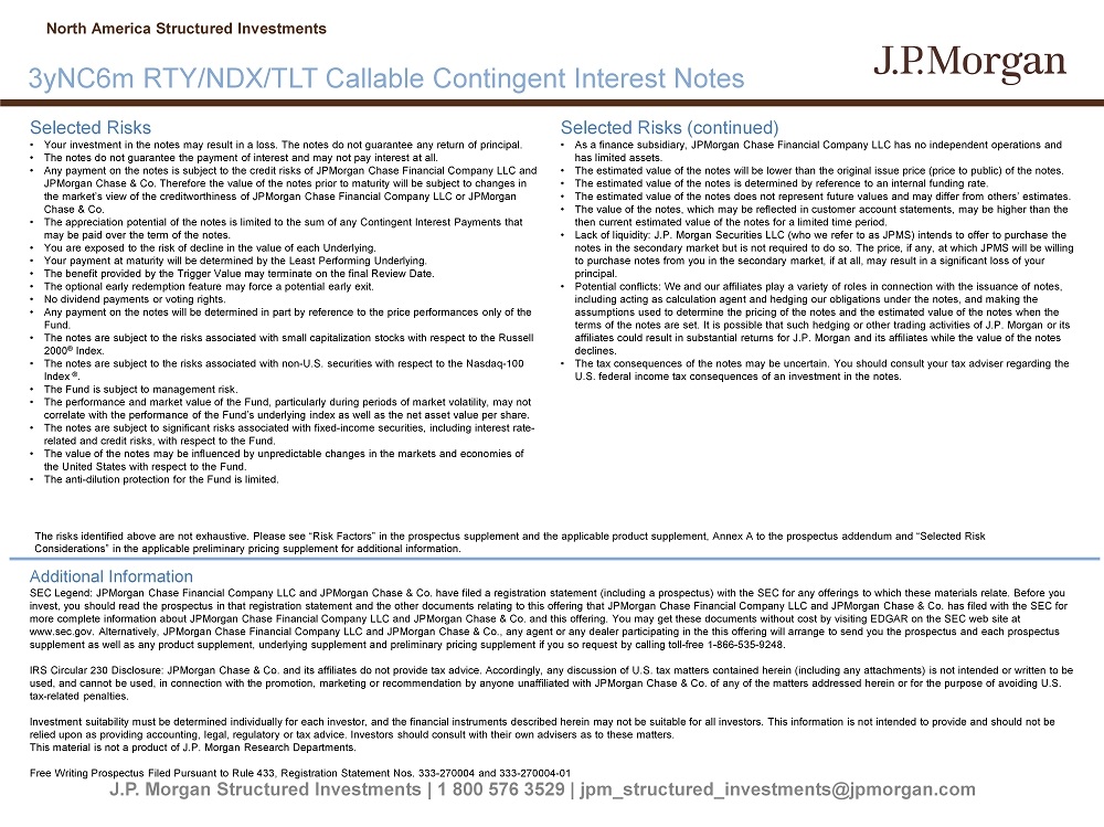J.P. Morgan Structured Investments | 1 800 576 3529 | jpm_structured_investments@jpmorgan.com Selected Risks • Your investment in the notes may result in a loss. The notes do not guarantee any return of principal. • The notes do not guarantee the payment of interest and may not pay interest at all. • Any payment on the notes is subject to the credit risks of JPMorgan Chase Financial Company LLC and JPMorgan Chase & Co. Therefore the value of the notes prior to maturity will be subject to changes in the market’s view of the creditworthiness of JPMorgan Chase Financial Company LLC or JPMorgan Chase & Co. • The appreciation potential of the notes is limited to the sum of any Contingent Interest Payments that may be paid over the term of the notes. • You are exposed to the risk of decline in the value of each Underlying. • Your payment at maturity will be determined by the Least Performing Underlying. • The benefit provided by the Trigger Value may terminate on the final Review Date. • The optional early redemption feature may force a potential early exit. • No dividend payments or voting rights. • Any payment on the notes will be determined in part by reference to the price performances only of the Fund. • The notes are subject to the risks associated with small capitalization stocks with respect to the Russell 2000 ® Index. • The notes are subject to the risks associated with non - U.S. securities with respect to the Nasdaq - 100 Index ® . • The Fund is subject to management risk. • The performance and market value of the Fund, particularly during periods of market volatility, may not correlate with the performance of the Fund’s underlying index as well as the net asset value per share. • The notes are subject to significant risks associated with fixed - income securities, including interest rate - related and credit risks, with respect to the Fund. • The value of the notes may be influenced by unpredictable changes in the markets and economies of the United States with respect to the Fund. • The anti - dilution protection for the Fund is limited. Selected Risks (continued) • As a finance subsidiary, JPMorgan Chase Financial Company LLC has no independent operations and has limited assets. • The estimated value of the notes will be lower than the original issue price (price to public) of the notes. • The estimated value of the notes is determined by reference to an internal funding rate. • The estimated value of the notes does not represent future values and may differ from others’ estimates. • The value of the notes, which may be reflected in customer account statements, may be higher than the then current estimated value of the notes for a limited time period. • Lack of liquidity: J.P. Morgan Securities LLC (who we refer to as JPMS) intends to offer to purchase the notes in the secondary market but is not required to do so. The price, if any, at which JPMS will be willing to purchase notes from you in the secondary market, if at all, may result in a significant loss of your principal. • Potential conflicts: We and our affiliates play a variety of roles in connection with the issuance of notes, including acting as calculation agent and hedging our obligations under the notes, and making the assumptions used to determine the pricing of the notes and the estimated value of the notes when the terms of the notes are set. It is possible that such hedging or other trading activities of J.P. Morgan or its affiliates could result in substantial returns for J.P. Morgan and its affiliates while the value of the notes declines. • The tax consequences of the notes may be uncertain. You should consult your tax adviser regarding the U.S. federal income tax consequences of an investment in the notes. Additional Information SEC Legend: JPMorgan Chase Financial Company LLC and JPMorgan Chase & Co. have filed a registration statement (including a pr osp ectus) with the SEC for any offerings to which these materials relate. Before you invest, you should read the prospectus in that registration statement and the other documents relating to this offering that JPM organ Chase Financial Company LLC and JPMorgan Chase & Co. has filed with the SEC for more complete information about JPMorgan Chase Financial Company LLC and JPMorgan Chase & Co. and this offering. You may get the se documents without cost by visiting EDGAR on the SEC web site at www.sec.gov. Alternatively, JPMorgan Chase Financial Company LLC and JPMorgan Chase & Co., any agent or any dealer participat ing in the this offering will arrange to send you the prospectus and each prospectus supplement as well as any product supplement, underlying supplement and preliminary pricing supplement if you so request by c all ing toll - free 1 - 866 - 535 - 9248. IRS Circular 230 Disclosure: JPMorgan Chase & Co. and its affiliates do not provide tax advice. Accordingly, any discussion o f U .S. tax matters contained herein (including any attachments) is not intended or written to be used, and cannot be used, in connection with the promotion, marketing or recommendation by anyone unaffiliated with JPMorgan Cha se & Co. of any of the matters addressed herein or for the purpose of avoiding U.S. tax - related penalties. Investment suitability must be determined individually for each investor, and the financial instruments described herein may not be suitable for all investors. This information is not intended to provide and should not be relied upon as providing accounting, legal, regulatory or tax advice. Investors should consult with their own advisers as to the se matters. This material is not a product of J.P. Morgan Research Departments. Free Writing Prospectus Filed Pursuant to Rule 433, Registration Statement Nos. 333 - 270004 and 333 - 270004 - 01 North America Structured Investments 3yNC6m RTY/NDX/TLT Callable Contingent Interest Notes The risks identified above are not exhaustive. Please see “Ris