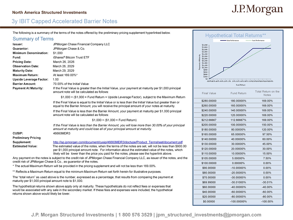 The following is a summary of the terms of the notes offered by the preliminary pricing supplement hyperlinked below. Summary of Terms Issuer: JPMorgan Chase Financial Company LLC Guarantor: JPMorgan Chase & Co. Minimum Denomination: $1,000 Fund: iShares ® Bitcoin Trust ETF Pricing Date: March 26, 2026 Observation Date: March 26, 2029 Maturity Date: March 29, 2029 Maximum Return: At least 169.00%* Upside Leverage Factor: 1.50 Barrier Amount: 70.00% of the Initial Value Payment At Maturity: If the Final Value is greater than the Initial Value, your payment at maturity per $1,000 principal amount note will be calculated as follows: $1,000 + ($1,000 î Fund Return î Upside Leverage Factor), subject to the Maximum Return If the Final Value is equal to the Initial Value or is less than the Initial Value but greater than or equal to the Barrier Amount, you will receive the principal amount of your notes at maturity. If the Final Value is less than the Barrier Amount, your payment at maturity per $1,000 principal amount note will be calculated as follows: $1,000 + ($1,000 î Fund Return) If the Final Value is less than the Barrier Amount, you will lose more than 30.00% of your principal amount at maturity and could lose all of your principal amount at maturity. CUSIP: 46660MDR3 Preliminary Pricing Supplement: http://sp.jpmorgan.com/document/cusip/46660MDR3/doctype/Product_Termsheet/document.pdf Estimated Value: The estimated value of the notes, when the terms of the notes are set, will not be less than $900.00 per $1,000 principal amount note. For information about the estimated value of the notes, which likely will be lower than the price you paid for the notes, please see the hyperlink above. Any payment on the notes is subject to the credit risk of JPMorgan Chase Financial Company LLC, as issuer of the notes, and t he credit risk of JPMorgan Chase & Co., as guarantor of the notes. * The actual Maximum Return will be provided in the pricing supplement and will not be less than 169.00%. Hypothetical Total Returns** J.P. Morgan Structured Investments | 1 800 576 3529 | jpm_structured_investments@jpmorgan.com Total Return on the Notes Fund Return Final Value 169.00% 180.00000% $280.00000 169.00% 160.00000% $260.00000 169.00% 140.00000% $240.00000 169.00% 120.00000% $220.00000 169.00% 112.66667% $212.66667 150.00% 100.00000% $200.00000 120.00% 80.00000% $180.00000 97.50% 65.00000% $165.00000 60.00% 40.00000% $140.00000 45.00% 30.00000% $130.00000 30.00% 20.00000% $120.00000 15.00% 10.00000% $110.00000 7.50% 5.00000% $105.00000 0.00% 0.00000% $100.00000 0.00% - 10.00000% $90.00000 0.00% - 20.00000% $80.00000 0.00% - 30.00000% $70.00000 - 30.01% - 30.01000% $69.99000 - 40.00% - 40.00000% $60.00000 - 60.00% - 60.00000% $40.00000 - 80.00% - 80.00000% $20.00000 - 100.00% - 100.00000% $0.00000 3y IBIT Capped Accelerated Barrier Notes North America Structured Investments ** Reflects a Maximum Return equal to the minimum Maximum Return set forth herein for illustrative purposes. The “total return” as used above is the number, expressed as a percentage, that results from comparing the payment at maturity per $1,000 principal amount note to $1,000. The hypothetical returns shown above apply only at maturity. These hypotheticals do not reflect fees or expenses that would be associated with any sale in the secondary market. If these fees and expenses were included, the hypothetical returns shown above would likely be lower.