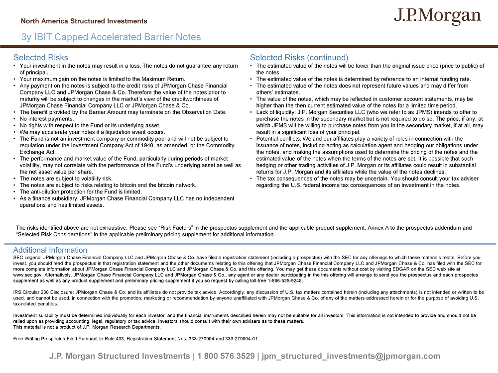 J.P. Morgan Structured Investments | 1 800 576 3529 | jpm_structured_investments@jpmorgan.com Selected Risks • Your investment in the notes may result in a loss. The notes do not guarantee any return of principal. • Your maximum gain on the notes is limited to the Maximum Return. • Any payment on the notes is subject to the credit risks of JPMorgan Chase Financial Company LLC and JPMorgan Chase & Co. Therefore the value of the notes prior to maturity will be subject to changes in the market’s view of the creditworthiness of JPMorgan Chase Financial Company LLC or JPMorgan Chase & Co. • The benefit provided by the Barrier Amount may terminate on the Observation Date. • No interest payments. • No rights with respect to the Fund or its underlying asset. • We may accelerate your notes if a liquidation event occurs. • The Fund is not an investment company or commodity pool and will not be subject to regulation under the Investment Company Act of 1940, as amended, or the Commodity Exchange Act. • The performance and market value of the Fund, particularly during periods of market volatility, may not correlate with the performance of the Fund’s underlying asset as well as the net asset value per share. • The notes are subject to volatility risk. • The notes are subject to risks relating to bitcoin and the bitcoin network. • The anti - dilution protection for the Fund is limited. • As a finance subsidiary, JPMorgan Chase Financial Company LLC has no independent operations and has limited assets. Selected Risks (continued) • The estimated value of the notes will be lower than the original issue price (price to public) of the notes. • The estimated value of the notes is determined by reference to an internal funding rate. • The estimated value of the notes does not represent future values and may differ from others’ estimates. • The value of the notes, which may be reflected in customer account statements, may be higher than the then current estimated value of the notes for a limited time period. • Lack of liquidity: J.P. Morgan Securities LLC (who we refer to as JPMS) intends to offer to purchase the notes in the secondary market but is not required to do so. The price, if any, at which JPMS will be willing to purchase notes from you in the secondary market, if at all, may result in a significant loss of your principal. • Potential conflicts: We and our affiliates play a variety of roles in connection with the issuance of notes, including acting as calculation agent and hedging our obligations under the notes, and making the assumptions used to determine the pricing of the notes and the estimated value of the notes when the terms of the notes are set. It is possible that such hedging or other trading activities of J.P. Morgan or its affiliates could result in substantial returns for J.P. Morgan and its affiliates while the value of the notes declines. • The tax consequences of the notes may be uncertain. You should consult your tax adviser regarding the U.S. federal income tax consequences of an investment in the notes. Additional Information SEC Legend: JPMorgan Chase Financial Company LLC and JPMorgan Chase & Co. have filed a registration statement (including a pr osp ectus) with the SEC for any offerings to which these materials relate. Before you invest, you should read the prospectus in that registration statement and the other documents relating to this offering that JPM organ Chase Financial Company LLC and JPMorgan Chase & Co. has filed with the SEC for more complete information about JPMorgan Chase Financial Company LLC and JPMorgan Chase & Co. and this offering. You may get the se documents without cost by visiting EDGAR on the SEC web site at www.sec.gov. Alternatively, JPMorgan Chase Financial Company LLC and JPMorgan Chase & Co., any agent or any dealer participat ing in the this offering will arrange to send you the prospectus and each prospectus supplement as well as any product supplement and preliminary pricing supplement if you so request by calling toll - free 1 - 866 - 535 - 9248. IRS Circular 230 Disclosure: JPMorgan Chase & Co. and its affiliates do not provide tax advice. Accordingly, any discussion o f U .S. tax matters contained herein (including any attachments) is not intended or written to be used, and cannot be used, in connection with the promotion, marketing or recommendation by anyone unaffiliated with JPMorgan Cha se & Co. of any of the matters addressed herein or for the purpose of avoiding U.S. tax - related penalties. Investment suitability must be determined individually for each investor, and the financial instruments described herein may not be suitable for all investors. This information is not intended to provide and should not be relied upon as providing accounting, legal, regulatory or tax advice. Investors should consult with their own advisers as to the se matters. This material is not a product of J.P. Morgan Research Departments. Free Writing Prospectus Filed Pursuant to Rule 433, Registration Statement Nos. 333 - 270004 and 333 - 270004 - 01 3y IBIT Capped Accelerated Barrier Notes North America Structured Investments The risks identified above are not exhaustive. Please see “Risk Factors” in the prospectus supplement and the applicable prod uct supplement, Annex A to the prospectus addendum and “Selected Risk Considerations” in the applicable preliminary pricing supplement for additional information.