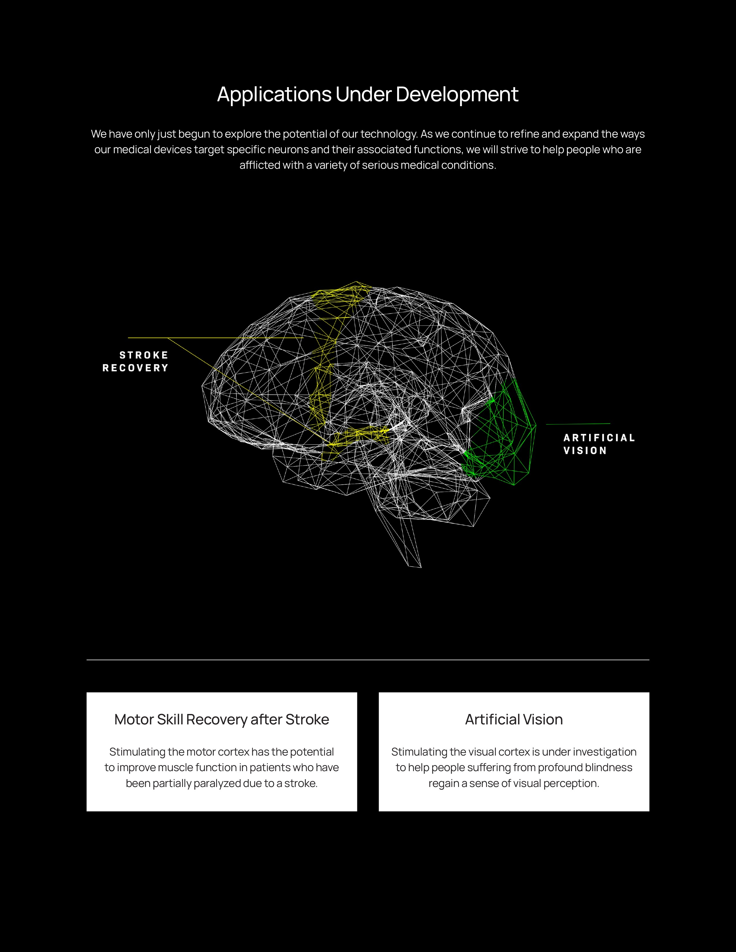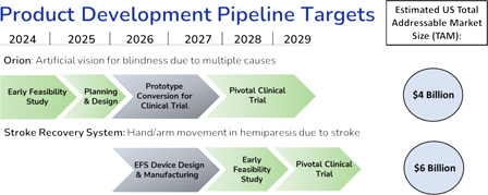 We are developing a platform technology with multiple potential applications: Our current-generation miniature neurostimulation device with 60 independently controlled cortical stimulation channels, supported by reliability data from the Argus II and Orion programs, is expected to serve as a platform for targeting other conditions with high unmet medical need. Technical evaluations of potential new indications for the technology began in 2021. We believe that our most promising next target will be to apply cortical neurostimulation to improve recovery of arm and hand function in partially paralyzed stroke patients who are undergoing rehabilitation after stroke. This medical treatment concept is supported by evidence from clinical studies conducted by Northstar Neuroscience, Inc. in the early 2000s using a single-channel electrical stimulation device that was placed on the motor cortex, the area of the brain surface that controls hand and arm motion (the same surface area of the brain where our device will be placed). Northstar reported achieving positive patient results in its Phase 1 and Phase 2 clinical studies (Cramer 2007) but a pivotal Phase 3 study failed to achieve statistical significance at the 4-week primary endpoint. Northstar was unable to obtain FDA approval and was eventually dissolved. It has been reported that a clinical benefit was demonstrated at six months (Levy 2016). We believe that our 60-channel cortical stimulation device has the potential to target neuron populations more precisely and generate favorable clinical results.