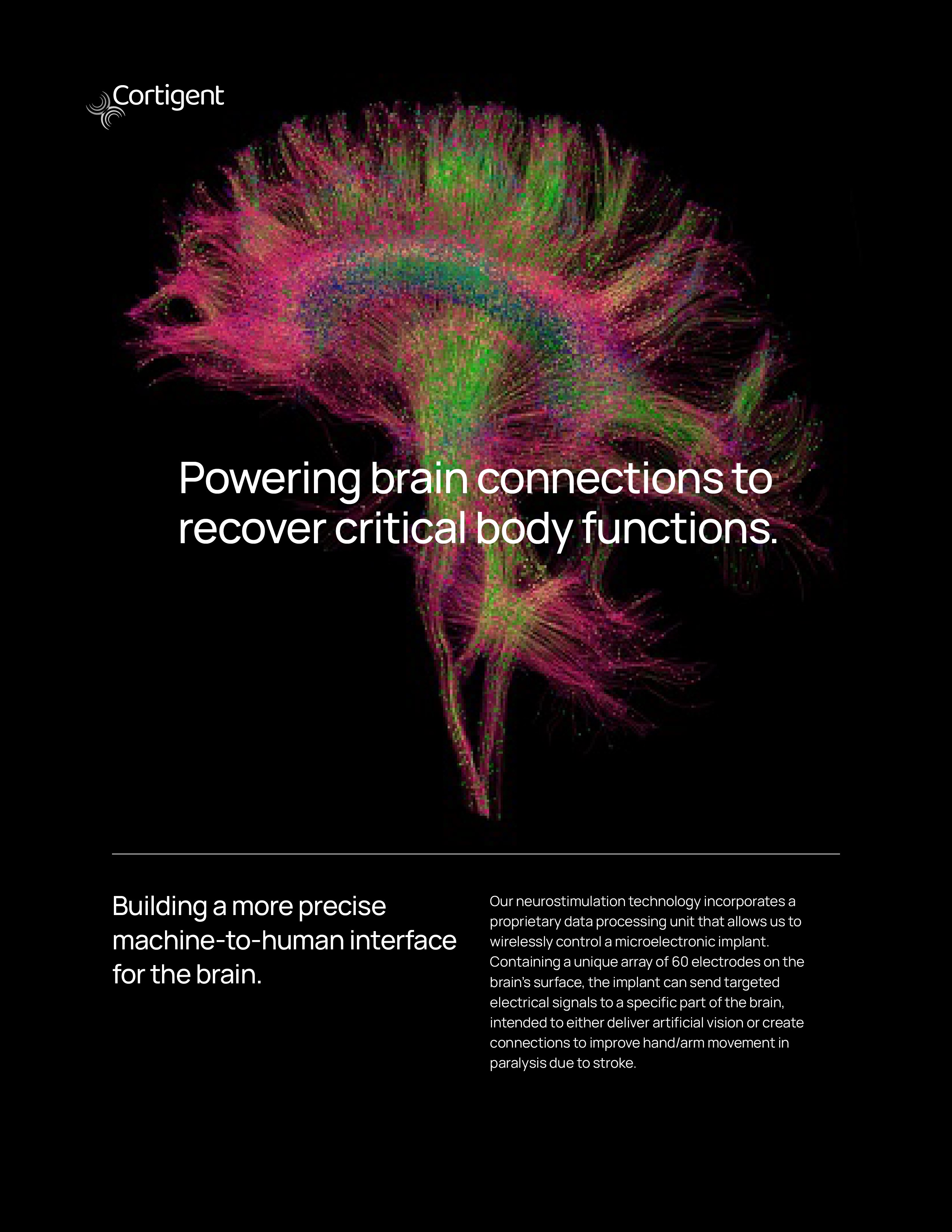 Cortigent, through its predecessor Second Sight Medical Products, Inc. (“Second Sight”), is a pioneer in developing precision targeted neurostimulation systems to help patients recover critical body functions. Our technology combines advanced neuroscience with proprietary microelectronics, software, and data processing capabilities to provide artificial vision and potentially restore muscle movement. Our first commercial system, Argus II®, a retinal implant, was approved by the U.S. Food and Drug Administration (“FDA”) under a Humanitarian Device Exemption (“HDE”) and has provided artificial vision to hundreds of profoundly blind people who were implanted with this device. Building on this neurostimulation platform we have completed an early feasibility clinical trial to evaluate a more advanced system for artificial vision that we call “Orion.” We are further exploring the application of our Orion® neurostimulation technology for accelerating the recovery of arm and hand function in patients who are partially paralyzed due to stroke. In February 2023, we held a meeting with FDA staff to commence discussions of an early feasibility clinical study in stroke victims. We believe that additional future applications of our platform technology may have the potential to generate substantial business growth over time.