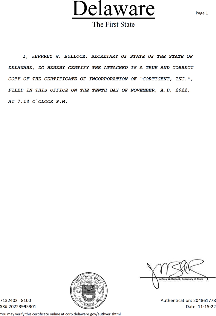 DelawareTheFirstStatePage171324028100Authentication:204861778SR#20223995301Date:11-15-22Youmayverifythiscertificateonlineatcorp.delaware.gov/authver.shtmlI,JEFFREYW.BULLOCK,SECRETARYOFSTATEOFTHESTATEOFDELAWARE,DOHEREBYCERTIFYTHEATTACHEDISATRUEANDCORRECTCOPYOFTHECERTIFICATEOFINCORPORATIONOF“CORTIGENT,INC.”,FILEDINTHISOFFICEONTHETENTHDAYOFNOVEMBER,A.D.2022,AT7:14O`CLOCKP.M.
