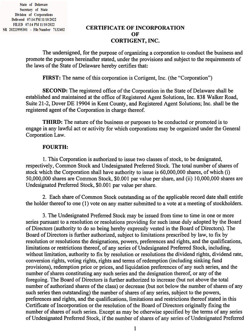 StateofDelawareSecretaryofStateDivisionofCorporationsDelivered07:14PM11/10/2022FEED07:14PM11/10/2022SR20223995301-FileNumber7132402CERTIFICATEOFINCORPORATIONOFCORTIGENT,INC,Theundersigned,forthepurposeoforganizingacorporationtoconductthebusinessandpromotethepurposeshereinafterstated,undertheprovisionsandsubjecttotherequirementsofthelawsoftheStateofDelawareherebycertifiesthat:FIRST:ThenameofthiscorporationisCortigent,Inc,(the"Corporation)SECOND:TheregisteredofficeoftheCorporationintheStateofDelawareshallbeestablishedandmaintainedattheofficeofRegisteredAgentSolutions,Inc.838WalkerRoad,Suite21-2,DoverDE19904inKentCounty,andRegisteredAgentSolutions;Inc.shallbetheregisteredagentoftheCorporationinchargethereof.THIRD:ThenatureofthebusinessorpurposestobeconductedorpromotedistoengageinanylawfulactoractivityforwhichcorporationsmaybeorganizedundertheGeneralCorporationLaw.FOURTH:ThisCorporationisauthorizedtoissuetwoclassesofstock,tobedesignated,respectively,CommonStockandUndesignatedPreferredStock.ThetotalnumberofsharesofstockwhichtheCorporationshallhaveauthoritytoissueis60,000,000shares,ofwhich(i)50,000,000sharesareCommonStock,$0.001parvaluepershare,and(ii)10,000,000sharesareUndesignatedPreferredStock,$0.001parvaluepershare,EachshareofCommonStockoutstandingasoftheapplicablerecorddateshallentitletheholderthereoftoone(1)voteonanymattersubmittedtoavoteatameetingofstockholders.TheUndesignatedPreferredStockmaybeissuedfromtimetotimeinoneormoreseriespursuanttoaresolutionorresolutionsprovidingforsuchissuedulyadoptedbytheBoardofDirectors(authoritytodosobeingherebyexpresslyvestedintheBoardofDirectors).TheBoardofDirectorsisfurtherauthorized,subjecttolimitationsprescribedbylaw,tofixbyresolutionorresolutionsthedesignations,powers,preferencesandrights,andthequalifications,limitationsorrestrictionsthereof,ofanyseriesofUndesignatedPreferredStock,including,withoutlimitation,authoritytofixbyresolutionorresolutionsthedividendrights,dividendrate,conversionrights,votingrights,rightsandtermsofredemption(includingsinkingfundprovisions),redemptionpriceorprices,andliquidationpreferencesofanysuchseries,andthenumberofsharesconstitutinganysuchseriesandthedesignationthereof,oranyoftheforegoing.TheBoardofDirectorsisfurtherauthorizedtoincrease(butnotabovethetotalnumberofauthorizedsharesoftheclass)ordecrease(butnotbelowthenumberofsharesofanysuchseriesthenoutstanding)thenumberofsharesofanyseries,subjecttothepowers,preferencesandrights,andthequalifications,limitationsandrestrictionsthereofstatedinthisCertificateofIncorporationortheresolutionoftheBoardofDirectorsoriginallyfixingthenumberofsharesofsuchseries.ExceptasmaybeotherwisespecifiedbythetermsofanyseriesofUndesignatedPreferredStock,ifthenumberofsharesofanyseriesofUndesignatedPreferred