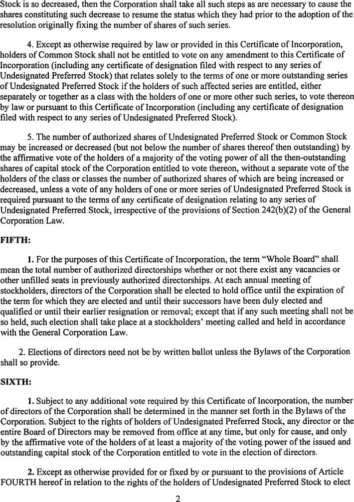 Stockissodecreased,thentheCorporationshalltakeallsuchstepsasarenecessarytocausethesharesconstitutingsuchdecreasetoresumethestatuswhichtheyhadpriortotheadoptionoftheresolutionoriginallyfixingthenumberofsharesofsuchseries.ExceptasotherwiserequiredbylaworprovidedinthisCertificateofIncorporation,holdersofCommonStockshallnotbeentitledtovoteonanyamendmenttothisCertificateofIncorporation(includinganycertificateofdesignationfiledwithrespecttoanyseriesofUndesignatedPreferredStock)thatrelatessolelytothetermsofoneormoreoutstandingseriesofUndesignatedPreferredStockiftheholdersofsuchaffectedseriesareentitled,eitherseparatelyortogetherasaclasswiththeholdersofoneormoreothersuchseries,tovotethereonbylaworpursuanttothisCertificateofIncorporation(includinganycertificateofdesignationfiledwithrespecttoanyseriesofUndesignatedPreferredStock).ThenumberofauthorizedsharesofUndesignatedPreferredStockorCommonStockmaybeincreasedordecreased(butnotbelowthenumberofsharesthereofthenoutstanding)bytheaffirmativevoteoftheholdersofamajorityofthevotingpowerofallthethen-outstandingsharesofcapitalstockoftheCorporationentitledtovotethereon,withoutaseparatevoteoftheholdersoftheclassorclassesthenumberofauthorizedsharesofwhicharebeingincreasedordecreased,unlessavoteofanyholdersofoneormoreseriesofUndesignatedPreferredStockisrequiredpursuanttothetermsofanycertificateofdesignationrelatingtoanyseriesofUndesignatedPreferredStock,irrespectiveoftheprovisionsofSection242(b)(2)oftheGeneralCorporationLaw.FIFTH:ForthepurposesofthisCertificateofIncorporation,theterm"WholeBoard"shallmeanthetotalnumberofauthorizeddirectorshipswhetherornotthereexistanyvacanciesorotherunfilledseatsinpreviouslyauthorizeddirectorships.Ateachannualmeetingofstockholders,directorsoftheCorporationshallbeelectedtoholdofficeuntiltheexpirationofthetermforwhichtheyareelectedanduntiltheirsuccessorshavebeendulyelectedandqualifiedoruntiltheirearlierresignationorremoval;exceptthatifanysuchmeetingshallnotbesoheld,suchelectionshalltakeplaceatastockholders'meetingcalledandheldinaccordancewiththeGeneralCorporationLaw.2.ElectionsofdirectorsneednotbebywrittenballotunlesstheBylawsoftheCorporationshallsoprovide.SIXTH:I.SubjecttoanyadditionalvoterequiredbythisCertificateofIncorporation,thenumberofdirectorsoftheCorporationshallbedeterminedinthemannersetforthintheBylawsoftheCorporation.SubjecttotherightsofholdersofUndesignatedPreferredStock,anydirectorortheentireBoardofDirectorsmayberemovedfromofficeatanytime,butonlyforcause,andonlybytheaffirmativevoteoftheholdersofatleastamajorityofthevotingpoweroftheissuedandoutstandingcapitalstockoftheCorporationentitledtovoteintheelectionofdirectors,2.ExceptasotherwiseprovidedfororfixedbyorpursuanttotheprovisionsofArticleFOURTHhereofinrelationtotherightsoftheholdersofUndesignatedPreferredStocktoelect