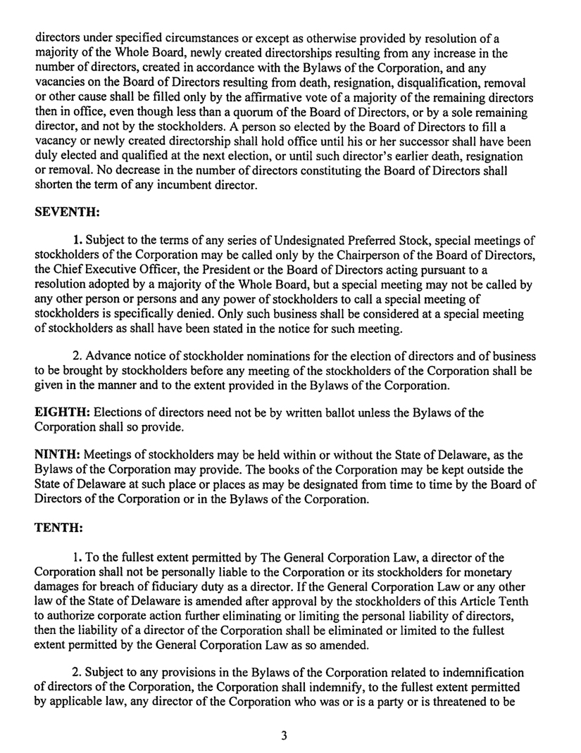 directorsunderspecifiedcircumstancesorexceptasotherwiseprovidedbyresolutionofamajorityoftheWholeBoard,newlycreateddirectorshipsresultingfromanyincreaseinthenumberofdirectors,createdinaccordancewiththeBylawsoftheCorporation,andanyvacanciesontheBoardofDirectorsresultingfromdeath,resignation,disqualification,removalorothercauseshallbefilledonlybytheaffirmativevoteofamajorityoftheremainingdirectorstheninoffice,eventhoughlessthanaquorumoftheBoardofDirectors,orbyasoleremainingdirector,andnotbythestockholders.ApersonsoelectedbytheBoardofDirectorstofillavacancyornewlycreateddirectorshipshallholdofficeuntilhisorhersuccessorshallhavebeendulyelectedandqualifiedatthenextelection,oruntilsuchdirector'searlierdeath,resignationorremoval.NodecreaseinthenumberofdirectorsconstitutingtheBoardofDirectorsshallshortenthetermofanyincumbentdirector.SEVENTH:SubjecttothetermsofanyseriesofUndesignatedPreferredStock,specialmeetingsofstockholdersoftheCorporationmaybecalledonlybytheChairpersonoftheBoardofDirectors,theChiefExecutiveOfficer,thePresidentortheBoardofDirectorsactingpursuanttoaresolutionadoptedbyamajorityoftheWholeBoard,butaspecialmeetingmaynotbecalledbyanyotherpersonorpersonsandanypowerofstockholderstocallaspecialmeetingofstockholdersisspecificallydenied.Onlysuchbusinessshallbeconsideredataspecialmeetingofstockholdersasshallhavebeenstatedinthenoticeforsuchmeeting.AdvancenoticeofstockholdernominationsfortheelectionofdirectorsandofbusinesstobebroughtbystockholdersbeforeanymeetingofthestockholdersoftheCorporationshallbegiveninthemannerandtotheextentprovidedintheBylawsoftheCorporation.EIGHTH:ElectionsofdirectorsneednotbebywrittenballotunlesstheBylawsoftheCorporationshallsoprovide.NINTH:MeetingsofstockholdersmaybeheldwithinorwithouttheStateofDelaware,astheBylawsoftheCorporationmayprovide.ThebooksoftheCorporationmaybekeptoutsidetheStateofDelawareatsuchplaceorplacesasmaybedesignatedfromtimetotimebytheBoardofDirectorsoftheCorporationorintheBylawsoftheCorporation.TENTH:TothefullestextentpermittedbyTheGeneralCorporationLaw,adirectoroftheCorporationshallnotbepersonallyliabletotheCorporationoritsstockholdersformonetarydamagesforbreachoffiduciarydutyasadirector.IftheGeneralCorporationLaworanyotherlawoftheStateofDelawareisamendedafterapprovalbythestockholdersofthisArticleTenthtoauthorizecorporateactionfurthereliminatingorlimitingthepersonalliabilityofdirectors,thentheliabilityofadirectoroftheCorporationshallbeeliminatedorlimitedtothefullestextentpermittedbytheGeneralCorporationLawassoamended.SubjecttoanyprovisionsintheBylawsoftheCorporationrelatedtoindemnificationofdirectorsoftheCorporation,theCorporationshallindemnify,tothefullestextentpermittedbyapplicablelaw,anydirectoroftheCorporationwhowasorisapartyoristhreatenedtobe
