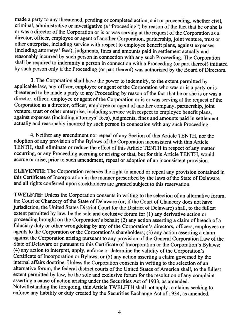 madeapartytoanythreatened,pendingorcompletedaction,suitorproceeding,whethercivil,criminal,administrativeorinvestigative(a"Proceeding")byreasonofthefactthatheorsheisorwasadirectoroftheCorporationorisorwasservingattherequestoftheCorporationasadirector,officer,employeeoragentofanotherCorporation,partnership,jointventure,trustorotherenterprise,includingservicewithrespecttoemployeebenefitplans,againstexpenses(includingattorneys'fees),judgments,finesandamountspaidinsettlementactuallyandreasonablyincurredbysuchpersoninconnectionwithanysuchProceeding.TheCorporationshallberequiredtoindemnifyapersoninconnectionwithaProceeding(orpartthereof)initiatedbysuchpersononlyiftheProceeding(orpartthereof)wasauthorizedbytheBoardofDirectors.TheCorporationshallhavethepowertoindemnify,totheextentpermittedbyapplicablelaw,anyofficer,employeeoragentoftheCorporationwhowasorisapartyoristhreatenedtobemadeapartytoanyProceedingbyreasonofthefactthatheorsheisorwasadirector,officer,employeeoragentoftheCorporationorisorwasservingattherequestoftheCorporationasadirector,officer,employeeoragentofanothercompany,partnership,jointventure,trustorotherenterprise,includingservicewithrespecttoemployeebenefitplans,againstexpenses(includingattorneys'fees),judgments,finesandamountspaidinsettlementactuallyandreasonablyincurredbysuchpersoninconnectionwithanysuchProceeding.NeitheranyamendmentnorrepealofanySectionofthisArticleTENTH,northeadoptionofanyprovisionoftheBylawsoftheCorporationinconsistentwiththisArticleTENTH,shalleliminateorreducetheeffectofthisArticleTENTHinrespectofanymatteroccurring,oranyProceedingaccruingorarisingorthat,butforthisArticleTENTH,wouldaccrueorarise,priortosuchamendment,repealoradoptionofaninconsistentprovision.ELEVENTH:TheCorporationreservestherighttoamendorrepealanyprovisioncontainedinthisCertificateofIncorporationinthemannerprescribedbythelawsoftheStateofDelawareandallrightsconferreduponstockholdersaregrantedsubjecttothisreservation.TWELFTH:UnlesstheCorporationconsentsinwritingtotheselectionofanalternativeforum,theCourtofChanceryoftheStateofDelaware(or,iftheCourtofChancerydoesnothavejurisdiction,theUnitedStatesDistrictCourtfortheDistrictofDelaware)shall,tothefullestextentpermittedbylaw,bethesoleandexclusiveforumfor(1)anyderivativeactionorproceedingbroughtontheCorporation'sbehalf;(2)anyactionassertingaclaimofbreachofafiduciarydutyorotherwrongdoingbyanyoftheCorporation'sdirectors,officers,employeesoragentstotheCorporationortheCorporation'sshareholders;(3)anyactionassertingaclaimagainsttheCorporationarisingpursuanttoanyprovisionoftheGeneralCorporationLawoftheStateofDelawareorpursuanttothisCertificateofIncorporationortheCorporation'sBylaws;(4)anyactiontointerpret,apply,enforceordeterminethevalidityoftheCorporation'sCertificateofIncorporationorBylaws;or(5)anyactionassertingaclaimgovernedbytheinternalaffairsdoctrine.UnlesstheCorporationconsentsinwritingtotheselectionofanalternativeforum,thefederaldistrictcourtsoftheUnitedStatesofAmericashall,tothefullestextentpermittedbylaw,bethesoleandexclusiveforumfortheresolutionofanycomplaintassertingacauseofactionarisingundertheSecuritiesActof1933,asamended.Notwithstandingtheforegoing,thisArticleTWELFTHshallnotapplytoclaimsseekingtoenforceanyliabilityordutycreatedbytheSecuritiesExchangeActof1934,asamended.