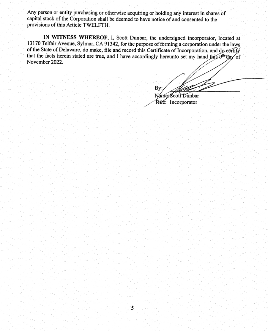 AnypersonorentitypurchasingorotherwiseacquiringorholdinganyinterestinsharesofcapitalstockoftheCorporationshallbedeemedtohavenoticeofandconsentedtotheprovisionsofthisArticleTWELFTH.INWITNESSWHEREOF,1,ScottDunbar,theundersignedincorporator,locatedat13170TelfairAvenue,Sylmar,CA91342,forthepurposeofformingacorporationunderthelawoftheStateofDelaware,domake,fileandrecordthisCertificateofIncorporation,anddo-thatthefactshereinstatedaretrue,andIhaveaccordinglyhereuntosetmyhandNovember2022.CO•unbarncorporator