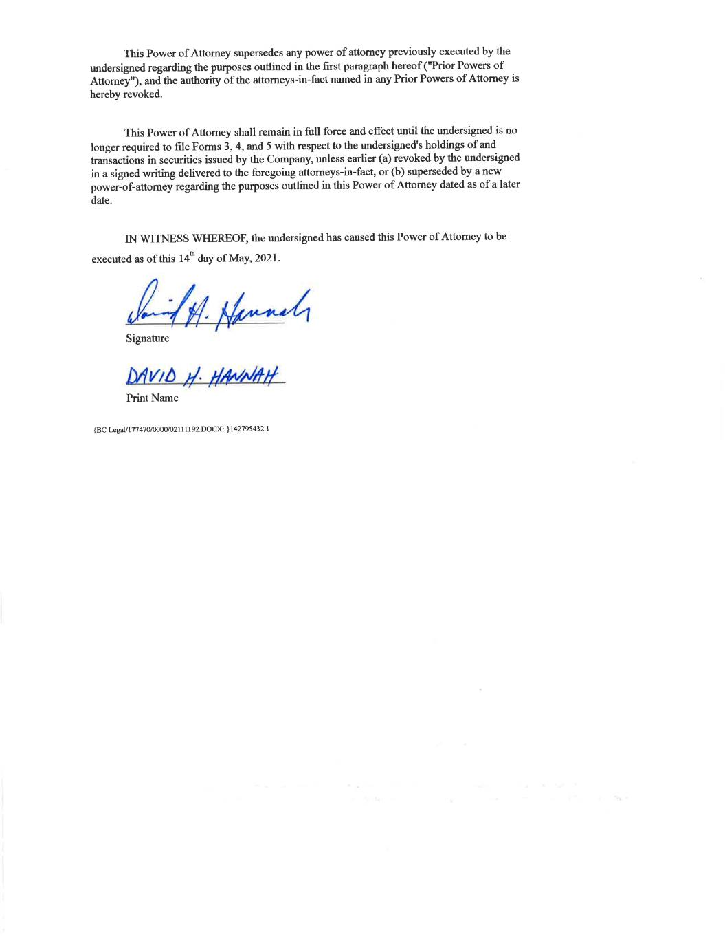 This Power of Attorney supersedes any power of attorney previously executed by the undersigned regarding the purposes outlined in the first paragraph hereof ("Prior Powers of Attorney"), and the authority of the attorneys-in-fact named in any Prior Powers of Attorney is hereby revoked. This Power of Attorney shall remain in full force and effect until the undersigned is no longer required to file Forms 3, 4, and 5 with respect to the undersigned's holdings of and transactions in securities issued by the Company, unless earlier (a) revoked by the undersigned in a signed writing delivered to the foregoing attorneys-in-fact, or (b) superseded by a new power-of-attorney regarding the purposes outlined in this Power of Attorney dated as of a later date. IN WITNESS WHEREOF, the undersigned has caused this Power of Attorney to be executed as of this 14" day of May, 2021. LAY. plnrel Signature DAVID y- YanHy Print Name {BC Legal/177470/0000/02111192, DOCX: }142795432.1