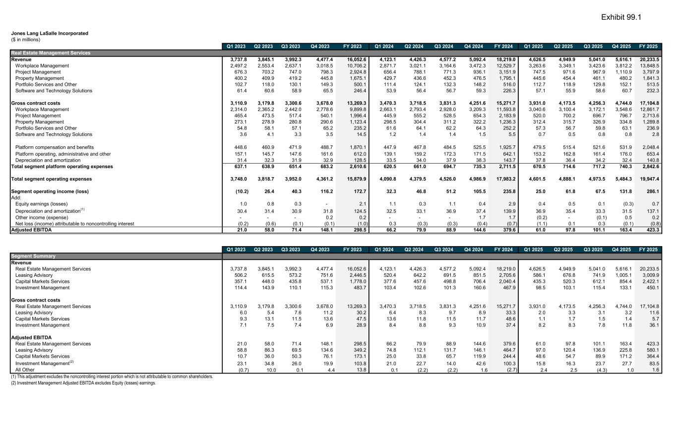 Jones Lang LaSalle Incorporated ($ in millions) Q1 2023 Q2 2023 Q3 2023 Q4 2023 FY 2023 Q1 2024 Q2 2024 Q3 2024 Q4 2024 FY 2024 Q1 2025 Q2 2025 Q3 2025 Q4 2025 FY 2025 Real Estate Management Services Revenue 3,737.8 3,845.1 3,992.3 4,477.4 16,052.6 4,123.1 4,426.3 4,577.2 5,092.4 18,219.0 4,626.5 4,949.9 5,041.0 5,616.1 20,233.5 Workplace Management 2,497.2 2,553.4 2,637.1 3,018.5 10,706.2 2,871.7 3,021.1 3,164.6 3,472.3 12,529.7 3,263.6 3,349.1 3,423.6 3,812.2 13,848.5 Project Management 676.3 703.2 747.0 798.3 2,924.8 656.4 788.1 771.3 936.1 3,151.9 747.5 971.6 967.9 1,110.9 3,797.9 Property Management 400.2 409.9 419.2 445.8 1,675.1 429.7 436.6 452.3 476.5 1,795.1 445.6 454.4 461.1 480.2 1,841.3 Portfolio Services and Other 102.7 118.0 130.1 149.3 500.1 111.4 124.1 132.3 148.2 516.0 112.7 118.9 129.8 152.1 513.5 Software and Technology Solutions 61.4 60.6 58.9 65.5 246.4 53.9 56.4 56.7 59.3 226.3 57.1 55.9 58.6 60.7 232.3 Gross contract costs 3,110.9 3,179.8 3,300.6 3,678.0 13,269.3 3,470.3 3,718.5 3,831.3 4,251.6 15,271.7 3,931.0 4,173.5 4,256.3 4,744.0 17,104.8 Workplace Management 2,314.0 2,365.2 2,442.0 2,778.6 9,899.8 2,663.1 2,793.4 2,928.0 3,209.3 11,593.8 3,040.6 3,100.4 3,172.1 3,548.6 12,861.7 Project Management 465.4 473.5 517.4 540.1 1,996.4 445.9 555.2 528.5 654.3 2,183.9 520.0 700.2 696.7 796.7 2,713.6 Property Management 273.1 278.9 280.8 290.6 1,123.4 298.5 304.4 311.2 322.2 1,236.3 312.4 315.7 326.9 334.8 1,289.8 Portfolio Services and Other 54.8 58.1 57.1 65.2 235.2 61.6 64.1 62.2 64.3 252.2 57.3 56.7 59.8 63.1 236.9 Software and Technology Solutions 3.6 4.1 3.3 3.5 14.5 1.2 1.4 1.4 1.5 5.5 0.7 0.5 0.8 0.8 2.8 Platform compensation and benefits 448.6 460.9 471.9 488.7 1,870.1 447.9 467.8 484.5 525.5 1,925.7 479.5 515.4 521.6 531.9 2,048.4 Platform operating, administrative and other 157.1 145.7 147.6 161.6 612.0 139.1 159.2 172.3 171.5 642.1 153.2 162.8 161.4 176.0 653.4 Depreciation and amortization 31.4 32.3 31.9 32.9 128.5 33.5 34.0 37.9 38.3 143.7 37.8 36.4 34.2 32.4 140.8 Total segment platform operating expenses 637.1 638.9 651.4 683.2 2,610.6 620.5 661.0 694.7 735.3 2,711.5 670.5 714.6 717.2 740.3 2,842.6 Total segment operating expenses 3,748.0 3,818.7 3,952.0 4,361.2 15,879.9 4,090.8 4,379.5 4,526.0 4,986.9 17,983.2 4,601.5 4,888.1 4,973.5 5,484.3 19,947.4 Segment operating income (loss) (10.2) 26.4 40.3 116.2 172.7 32.3 46.8 51.2 105.5 235.8 25.0 61.8 67.5 131.8 286.1 Add: Equity earnings (losses) 1.0 0.8 0.3 - 2.1 1.1 0.3 1.1 0.4 2.9 0.4 0.5 0.1 (0.3) 0.7 Depreciation and amortization(1) 30.4 31.4 30.9 31.8 124.5 32.5 33.1 36.9 37.4 139.9 36.9 35.4 33.3 31.5 137.1 Other income (expense) - - - 0.2 0.2 - - - 1.7 1.7 (0.2) - (0.1) 0.5 0.2 Net loss (income) attributable to noncontrolling interest (0.2) (0.6) (0.1) (0.1) (1.0) 0.3 (0.3) (0.3) (0.4) (0.7) (1.1) 0.1 0.3 (0.1) (0.8) Adjusted EBITDA 21.0 58.0 71.4 148.1 298.5 66.2 79.9 88.9 144.6 379.6 61.0 97.8 101.1 163.4 423.3 Q1 2023 Q2 2023 Q3 2023 Q4 2023 FY 2023 Q1 2024 Q2 2024 Q3 2024 Q4 2024 FY 2024 Q1 2025 Q2 2025 Q3 2025 Q4 2025 FY 2025 Segment Summary Revenue Real Estate Management Services 3,737.8 3,845.1 3,992.3 4,477.4 16,052.6 4,123.1 4,426.3 4,577.2 5,092.4 18,219.0 4,626.5 4,949.9 5,041.0 5,616.1 20,233.5 Leasing Advisory 506.2 615.5 573.2 751.6 2,446.5 520.4 642.2 691.5 851.5 2,705.6 586.1 676.8 741.9 1,005.1 3,009.9 Capital Markets Services 357.1 448.0 435.8 537.1 1,778.0 377.6 457.6 498.8 706.4 2,040.4 435.3 520.3 612.1 854.4 2,422.1 Investment Management 114.4 143.9 110.1 115.3 483.7 103.4 102.6 101.3 160.6 467.9 98.5 103.1 115.4 133.1 450.1 Gross contract costs Real Estate Management Services 3,110.9 3,179.8 3,300.6 3,678.0 13,269.3 3,470.3 3,718.5 3,831.3 4,251.6 15,271.7 3,931.0 4,173.5 4,256.3 4,744.0 17,104.8 Leasing Advisory 6.0 5.4 7.6 11.2 30.2 6.4 8.3 9.7 8.9 33.3 2.0 3.3 3.1 3.2 11.6 Capital Markets Services 9.3 13.1 11.5 13.6 47.5 13.6 11.8 11.5 11.7 48.6 1.1 1.7 1.5 1.4 5.7 Investment Management 7.1 7.5 7.4 6.9 28.9 8.4 8.8 9.3 10.9 37.4 8.2 8.3 7.8 11.8 36.1 Adjusted EBITDA Real Estate Management Services 21.0 58.0 71.4 148.1 298.5 66.2 79.9 88.9 144.6 379.6 61.0 97.8 101.1 163.4 423.3 Leasing Advisory 58.8 86.3 69.5 134.6 349.2 74.8 112.1 131.7 146.1 464.7 97.0 120.4 136.9 225.8 580.1 Capital Markets Services 10.7 36.0 50.3 76.1 173.1 25.0 33.8 65.7 119.9 244.4 48.6 54.7 89.9 171.2 364.4 Investment Management(2) 23.1 34.8 26.0 19.9 103.8 21.0 22.7 14.0 42.6 100.3 15.8 16.3 23.7 27.7 83.5 All Other (0.7) 10.0 0.1 4.4 13.8 0.1 (2.2) (2.2) 1.6 (2.7) 2.4 2.5 (4.3) 1.0 1.6 (1) This adjustment excludes the noncontrolling interest portion which is not attributable to common shareholders. (2) Investment Management Adjusted EBITDA excludes Equity (losses) earnings. Exhibit 99.1