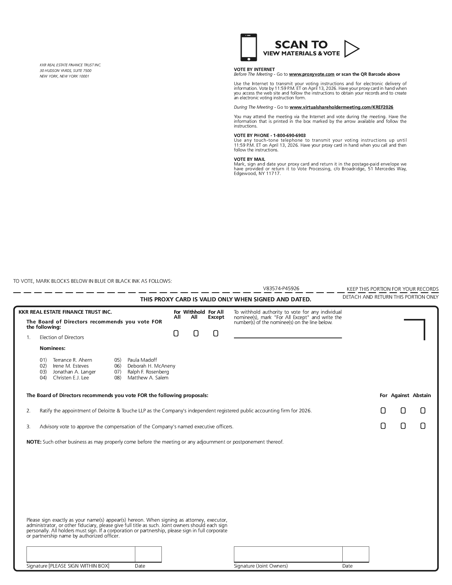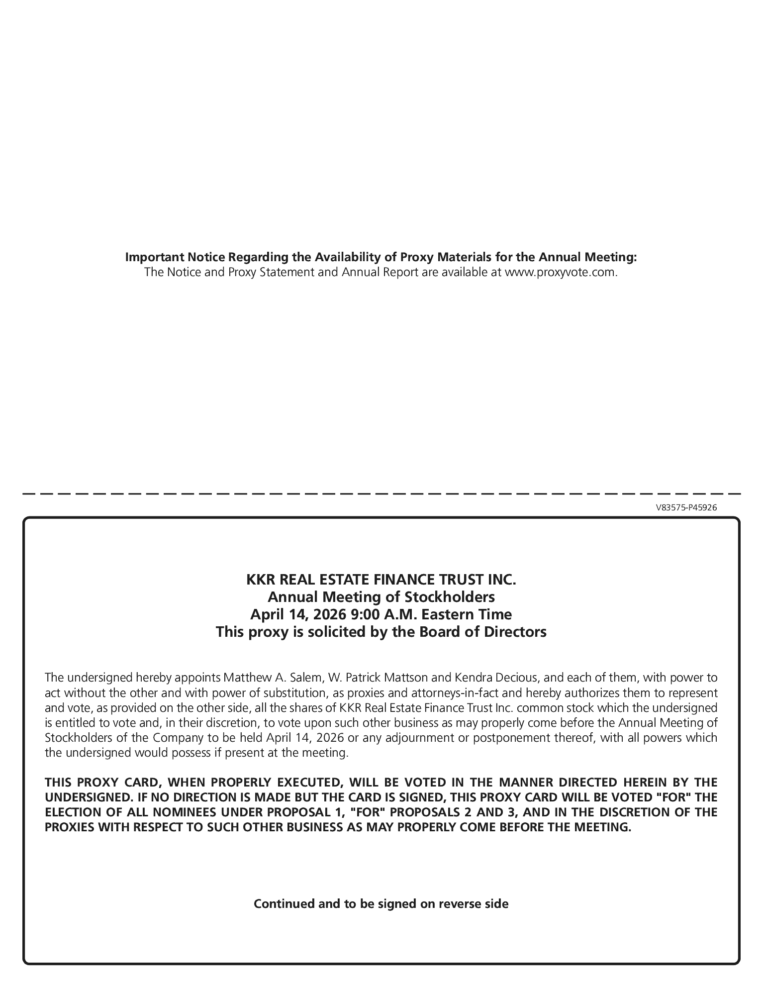 You are cordially invited to attend the 2026 annual meeting of stockholders (the “Annual Meeting”) of KKR Real Estate Finance Trust Inc., a Maryland corporation (the “Company”), which will be held virtually at 9:00 a.m., Eastern Time, on Tuesday, April 14, 2026. The Annual Meeting will be a virtual meeting of stockholders, held solely by means of remote communication.