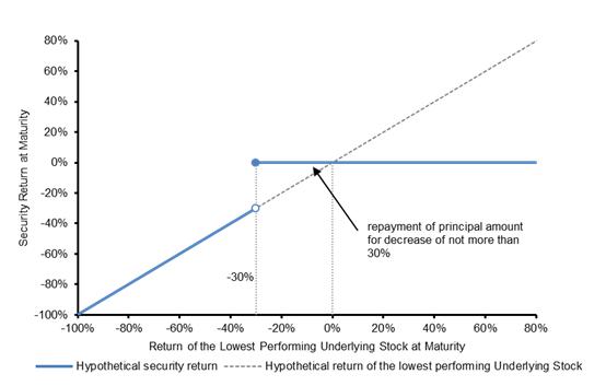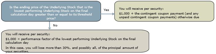 The above figures are for purposes of illustration only and may have been rounded for ease of analysis. If the securities are not automatically called prior to stated maturity, the actual amount you will receive at stated maturity will depend on the actual ending price of the lowest performing Underlying Stock on the final calculation day. The performance of the better performing Underlying Stocks is not relevant to your return on the securities.