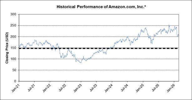 The following graph sets forth daily closing prices of the AMZN Stock for the period from January 1, 2021 to February 27, 2026. The closing price on February 27, 2026 was $210.00. The closing prices below may reflect adjustments in response to certain corporate actions, such as stock splits, public offerings, mergers and acquisitions, spin-offs, extraordinary dividends, delistings and bankruptcy.