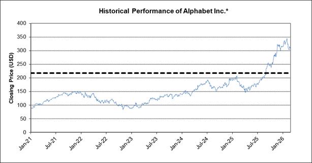 The following graph sets forth daily closing prices of the GOOG Stock for the period from January 1, 2021 to February 27, 2026. The closing price on February 27, 2026 was $311.43. The closing prices below may reflect adjustments in response to certain corporate actions, such as stock splits, public offerings, mergers and acquisitions, spin-offs, extraordinary dividends, delistings and bankruptcy.