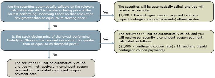 The securities would not be automatically called, even though the stock closing prices of the better performing Underlying Stocks on hypothetical calculation day #2 are greater than their hypothetical starting prices. In addition, since the hypothetical stock closing price of the lowest performing Underlying Stock on hypothetical calculation day #2 is less than its hypothetical threshold price, you would not receive a contingent coupon payment on the applicable contingent coupon payment date. As this example illustrates, whether the securities are automatically called and whether you receive a contingent coupon payment on a contingent coupon payment date will depend solely on the stock closing price of the lowest performing Underlying Stock on hypothetical calculation day #2. This will be the case even if the better performing Underlying Stocks perform favorably. The performance of the better performing Underlying Stocks is not relevant to your return on the securities.