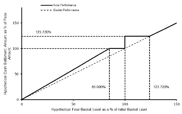 | · | if the basket return is negative and is below -15.00% (the final basket level is less than the initial basket level by more than 15.00%), the sum of (i) $1,000 plus (ii) the product of (a) $1,000 times (b) approximately 1.1765 times (c) the sum of the basket return plus 15.00% (in which case you will receive less than $1,000). |