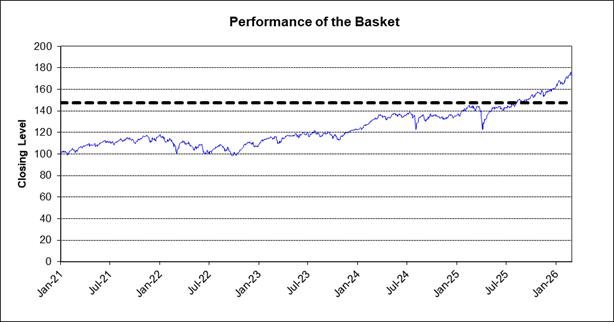 The graph below sets forth the performance of the basket from January 4, 2021 through March 2, 2026 assuming the basket underliers are weighted as set forth above on January 4, 2021 and that the initial basket level was 100 on January 4, 2021. The dotted line indicates a hypothetical buffer level of 85.00% of the level of the basket on March 2, 2026. The actual buffer level will be equal to 85.00% of the initial basket level. You cannot predict the future performance of any basket underlier or of the basket as a whole, or whether increases in the level of any basket underlier will be offset by decreases in the levels of the other basket underliers. The historical performance of the basket and the degree of correlation between the value trends of the basket underliers (or lack thereof) should not be taken as an indication of the future performance of the basket. We cannot give you any assurance that the future performance of the basket or the basket underliers will result in your receiving the return of any of your initial investment on the stated maturity date.