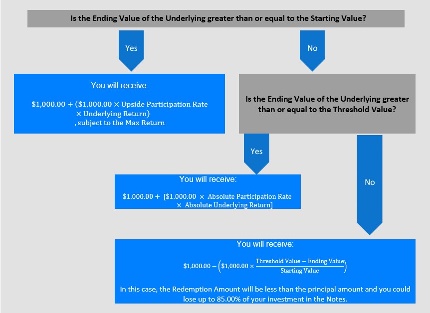 •If the Ending Value of the Underlying is less than its Starting Value but greater than or equal to 85% of its Starting Value, at maturity, you will receive a positive return equal to the absolute value of the percentage decline in the Ending Value of the Underlying from its Starting Value. Otherwise , at maturity your investment will be subject to 1:1 downside exposure to decreases in the value of the Underlying beyond a 15% decline, with up to 85% of the principal at risk.