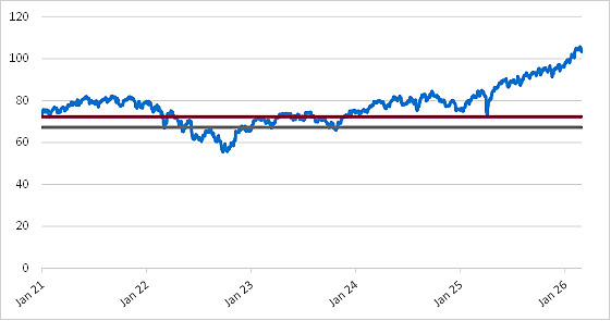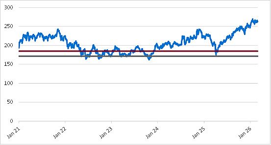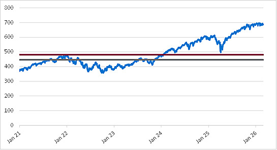The following graph sets forth the daily historical performance of the SPY in the period from January 2, 2021 through February 27, 2026. We obtained this historical data from Bloomberg L.P. We have not independently verified the accuracy or completeness of the information obtained from Bloomberg L.P. The horizontal crimson line in the graph represents the SPY’s hypothetical Coupon Barrier of $480.19 (rounded to two decimal places), which is 70% of the SPY’s hypothetical Initial Value of $685.99, which was its Closing Market Price on February 27, 2026. The horizontal gray line in the graph represents the SPY’s hypothetical Downside Threshold of $445.89 (rounded to two decimal places), which is 65% of the SPY’s hypothetical Initial Value. The actual Initial Value, Coupon Barrier and Downside Threshold will be determined on the Trade Date.