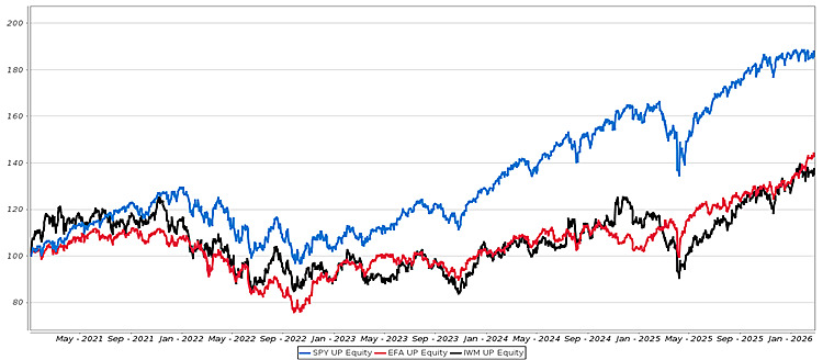 The graph below illustrates the daily performance of the EFA, the IWM and the SPY from January 2, 2021 through February 27, 2026. For comparison purposes, each Underlying has been “normalized” to have a Closing Market Price of 100 on January 2, 2021 by dividing the Closing Market Price of that Underlying on each trading day by the Closing Market Price of that Underlying on January 2, 2021 and multiplying by 100. We obtained the Closing Market Prices used to determine the normalized Closing Market Prices set forth below from Bloomberg L.P., without independent verification.
