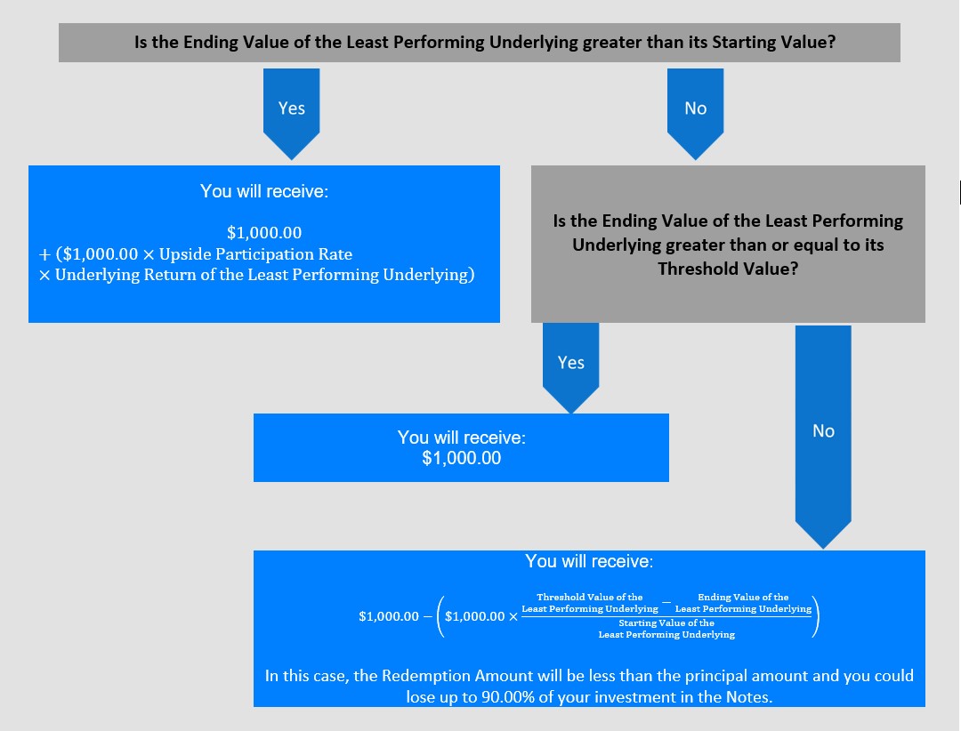 The following table is for purposes of illustration only. It is based on hypothetical values and shows hypothetical returns on the Notes. The table illustrates the calculation of the Redemption Amount and the return on the Notes based on a hypothetical Starting Value of 100 for the Least Performing Underlying, a hypothetical Threshold Value of 90 for the Least Performing Underlying, the Upside Participation Rate of 136.00% and a range of hypothetical Ending Values of the Least Performing Underlying. The actual amount you receive and the resulting return will depend on the actual Starting Values, Threshold Values and Ending Values of the Underlyings, and whether you hold the Notes to maturity. The following examples do not take into account any tax consequences from investing in the Notes.