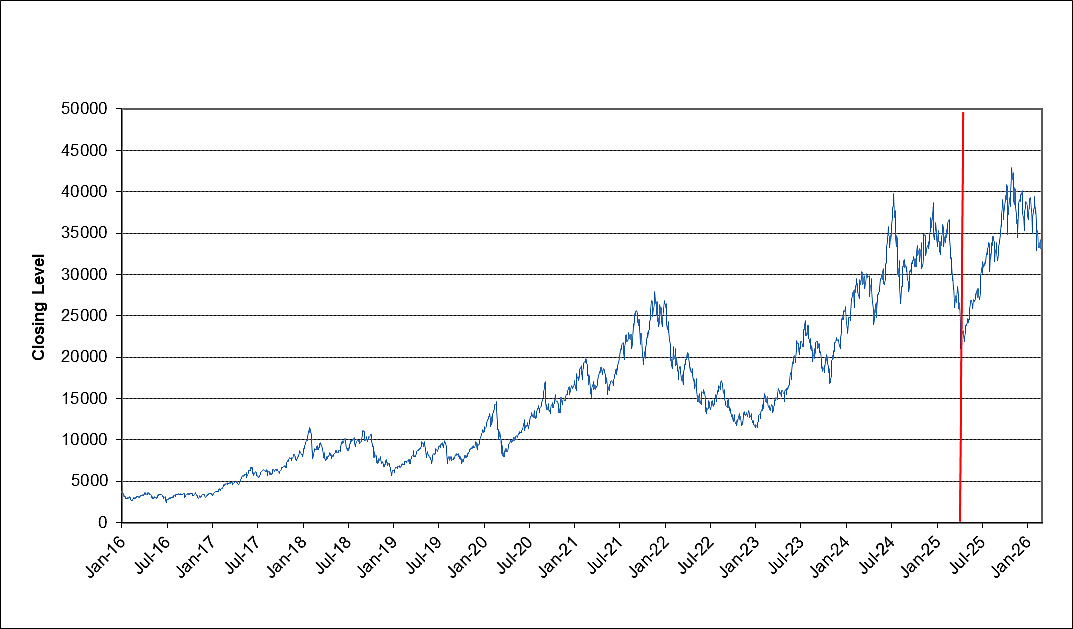 The Index Calculation Agent began calculating the Index on a live basis on April 22, 2025. All values of the Index prior to that date are calculated using available data as to how the Index may have performed in the pre-launch date period. Accordingly, the graph below illustrates: