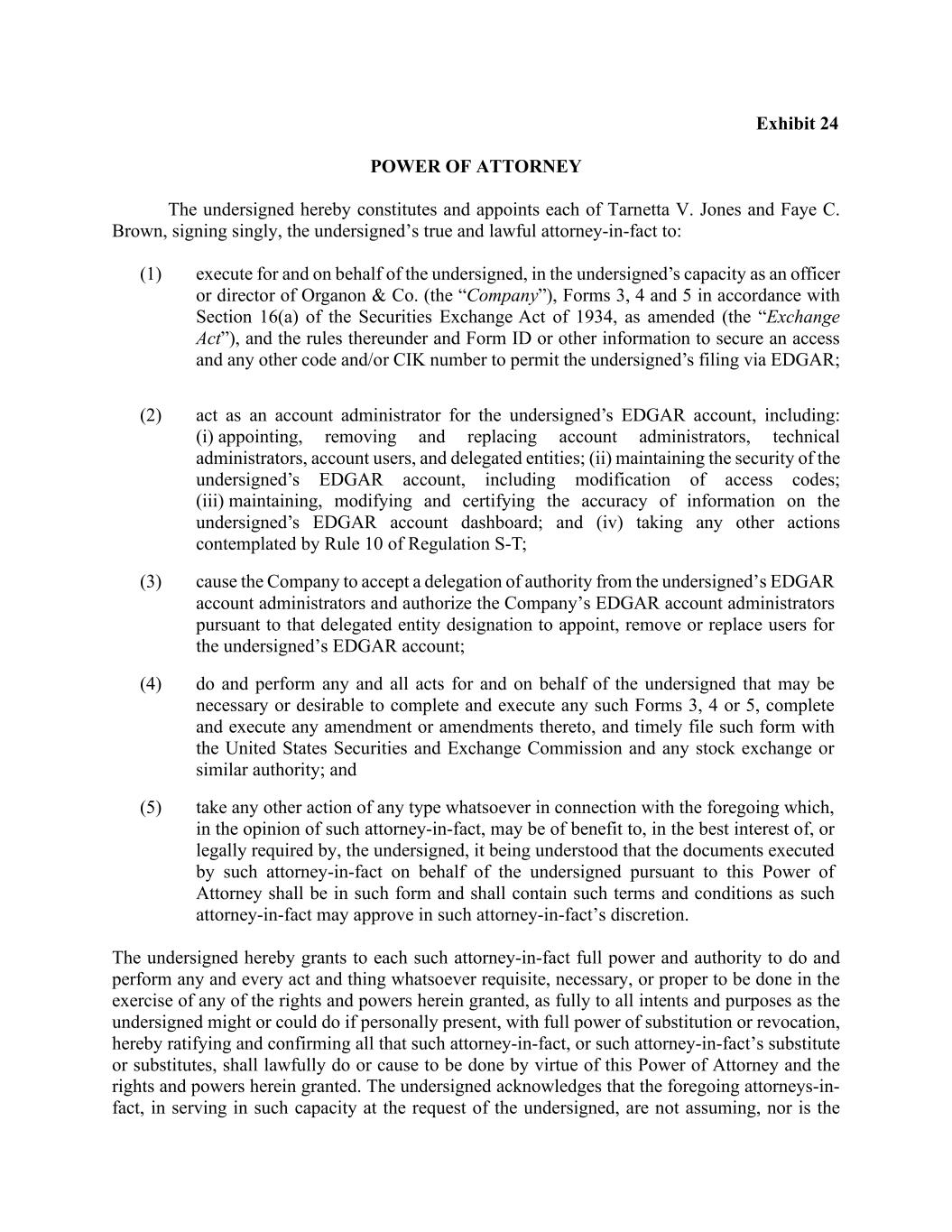 Exhibit 24 POWER OF ATTORNEY The undersigned hereby constitutes and appoints each of Tarnetta V. Jones and Faye C. Brown, signing singly, the undersigned’s true and lawful attorney-in-fact to: (1) execute for and on behalf of the undersigned, in the undersigned’s capacity as an officer or director of Organon & Co. (the “Company”), Forms 3, 4 and 5 in accordance with Section 16(a) of the Securities Exchange Act of 1934, as amended (the “Exchange Act”), and the rules thereunder and Form ID or other information to secure an access and any other code and/or CIK number to permit the undersigned’s filing via EDGAR; (2) act as an account administrator for the undersigned’s EDGAR account, including: (i) appointing, removing and replacing account administrators, technical administrators, account users, and delegated entities; (ii) maintaining the security of the undersigned’s EDGAR account, including modification of access codes; (iii) maintaining, modifying and certifying the accuracy of information on the undersigned’s EDGAR account dashboard; and (iv) taking any other actions contemplated by Rule 10 of Regulation S-T; (3) cause the Company to accept a delegation of authority from the undersigned’s EDGAR account administrators and authorize the Company’s EDGAR account administrators pursuant to that delegated entity designation to appoint, remove or replace users for the undersigned’s EDGAR account; (4) do and perform any and all acts for and on behalf of the undersigned that may be necessary or desirable to complete and execute any such Forms 3, 4 or 5, complete and execute any amendment or amendments thereto, and timely file such form with the United States Securities and Exchange Commission and any stock exchange or similar authority; and (5) take any other action of any type whatsoever in connection with the foregoing which, in the opinion of such attorney-in-fact, may be of benefit to, in the best interest of, or legally required by, the undersigned, it being understood that the documents executed by such attorney-in-fact on behalf of the undersigned pursuant to this Power of Attorney shall be in such form and shall contain such terms and conditions as such attorney-in-fact may approve in such attorney-in-fact’s discretion. The undersigned hereby grants to each such attorney-in-fact full power and authority to do and perform any and every act and thing whatsoever requisite, necessary, or proper to be done in the exercise of any of the rights and powers herein granted, as fully to all intents and purposes as the undersigned might or could do if personally present, with full power of substitution or revocation, hereby ratifying and confirming all that such attorney-in-fact, or such attorney-in-fact’s substitute or substitutes, shall lawfully do or cause to be done by virtue of this Power of Attorney and the rights and powers herein granted. The undersigned acknowledges that the foregoing attorneys-in- fact, in serving in such capacity at the request of the undersigned, are not assuming, nor is the