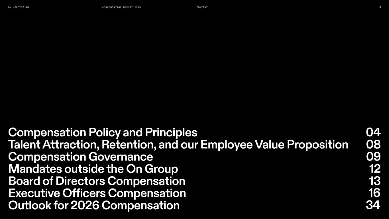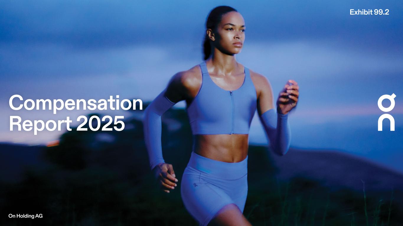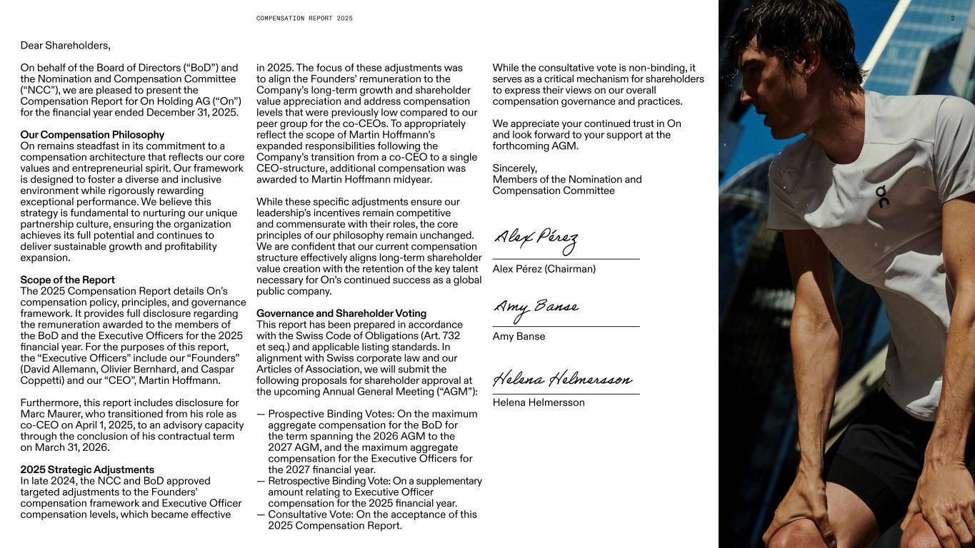 COMPENSATION REPORT 2025 Dear Shareholders, On behalf of the Board of Directors (“BoD”) and the Nomination and Compensation Committee (“NCC”), we are pleased to present the Compensation Report for On Holding AG (“On”) for the financial year ended December 31, 2025. Our Compensation Philosophy On remains steadfast in its commitment to a compensation architecture that reflects our core values and entrepreneurial spirit. Our framework is designed to foster a diverse and inclusive environment while rigorously rewarding exceptional performance. We believe this strategy is fundamental to nurturing our unique partnership culture, ensuring the organization achieves its full potential and continues to deliver sustainable growth and profitability expansion. Scope of the Report The 2025 Compensation Report details On’s compensation policy, principles, and governance framework. It provides full disclosure regarding the remuneration awarded to the members of the BoD and the Executive Officers for the 2025 financial year. For the purposes of this report, the “Executive Officers” include our “Founders” (David Allemann, Olivier Bernhard, and Caspar Coppetti) and our “CEO”, Martin Hoffmann. Furthermore, this report includes disclosure for Marc Maurer, who transitioned from his role as co-CEO on April 1, 2025, to an advisory capacity through the conclusion of his contractual term on March 31, 2026. 2025 Strategic Adjustments In late 2024, the NCC and BoD approved targeted adjustments to the Founders’ compensation framework and Executive Officer compensation levels, which became effective in 2025. The focus of these adjustments was to align the Founders’ remuneration to the Company’s long-term growth and shareholder value appreciation and address compensation levels that were previously low compared to our peer group for the co-CEOs. To appropriately reflect the scope of Martin Hoffmann’s expanded responsibilities following the Company’s transition from a co-CEO to a single CEO-structure, additional compensation was awarded to Martin Hoffmann midyear. While these specific adjustments ensure our leadership’s incentives remain competitive and commensurate with their roles, the core principles of our philosophy remain unchanged. We are confident that our current compensation structure effectively aligns long-term shareholder value creation with the retention of the key talent necessary for On’s continued success as a global public company. Governance and Shareholder Voting This report has been prepared in accordance with the Swiss Code of Obligations (Art. 732 et seq.) and applicable listing standards. In alignment with Swiss corporate law and our Articles of Association, we will submit the following proposals for shareholder approval at the upcoming Annual General Meeting (“AGM”): — Prospective Binding Votes: On the maximum aggregate compensation for the BoD for the term spanning the 2026 AGM to the 2027 AGM, and the maximum aggregate compensation for the Executive Officers for the 2027 financial year. — Retrospective Binding Vote: On a supplementary amount relating to Executive Officer compensation for the 2025 financial year. — Consultative Vote: On the acceptance of this 2025 Compensation Report. Alex Pérez (Chairman) Amy Banse Helena Helmersson 2 While the consultative vote is non-binding, it serves as a critical mechanism for shareholders to express their views on our overall compensation governance and practices. We appreciate your continued trust in On and look forward to your support at the forthcoming AGM. Sincerely, Members of the Nomination and Compensation Committee